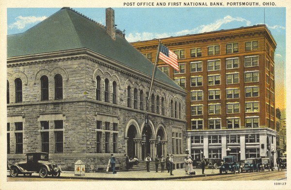 Colorized image of Chillicothe Street view of the First National Bank (right) and the old stone Post Office (left) after it was expanded in 1914. Gallia Street runs between the buildings. The post office was closed in 1936, and razed in 1956 for the construction of a five story Montgomery-Ward Department Store.