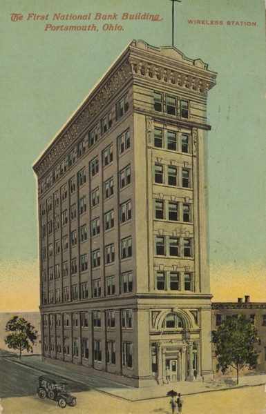 Black and white image of the bank building at the south east corner of Gallia and Chillicothe Streets. This is the first half completed in 1912. In about 1924 an identical addition was added on the south side where the Lyric Theater had stood.