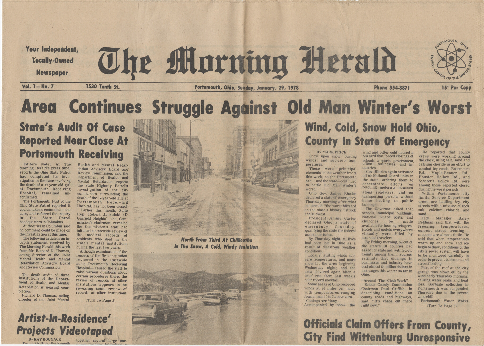 Yellowed, aged newspaper, The Morning Herald, issues V. 1, No. 7, Portsmouth, Ohio. 6 pages. (1978 Blizzard)