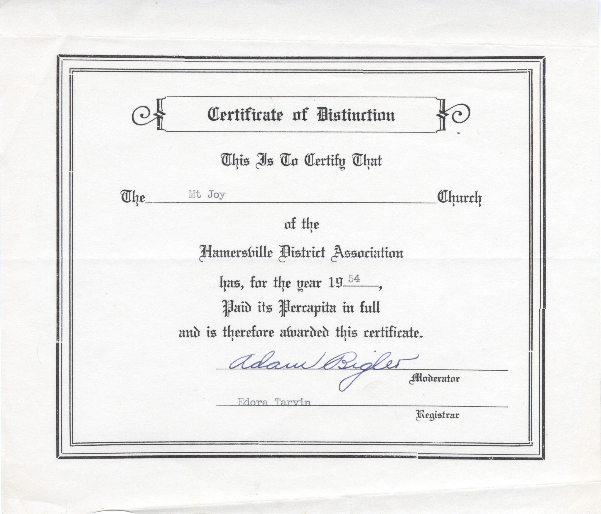 Black and white paper certificate to Mt. Joy Church for payment percapita for the year from Hamersville District Association. Handwritten, fonts and typed.