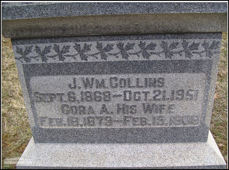 - Photo image of the headstone of J. William and Cora A. Collins in Jacktown Cemetery located in Adams County. This cemetery is also known as Jacksonville Cemetery.