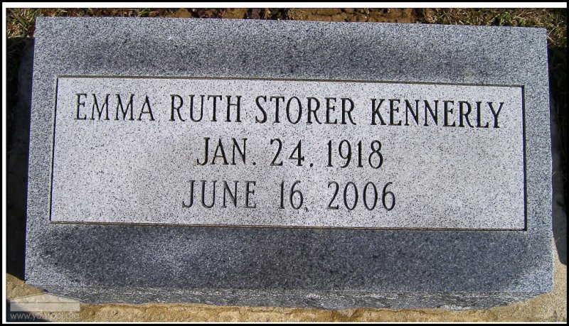 - Photo image of the headstone of Emma Ruth Storer Kennerly in Prospect Cemetery located in Highland County.