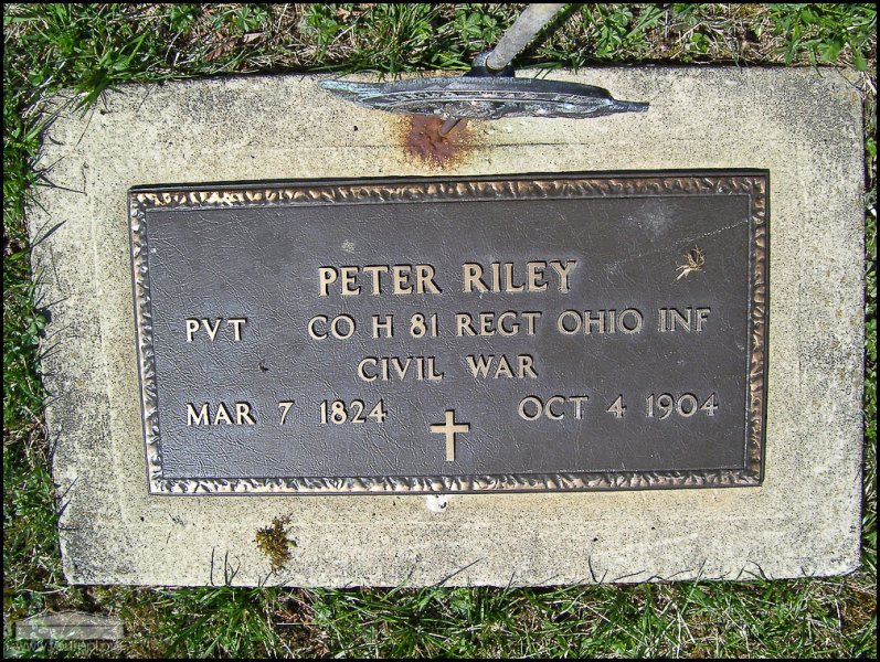 - Photo image of the headstone of Peter Riley in Mt. Joy Cemetery located in Scioto County.