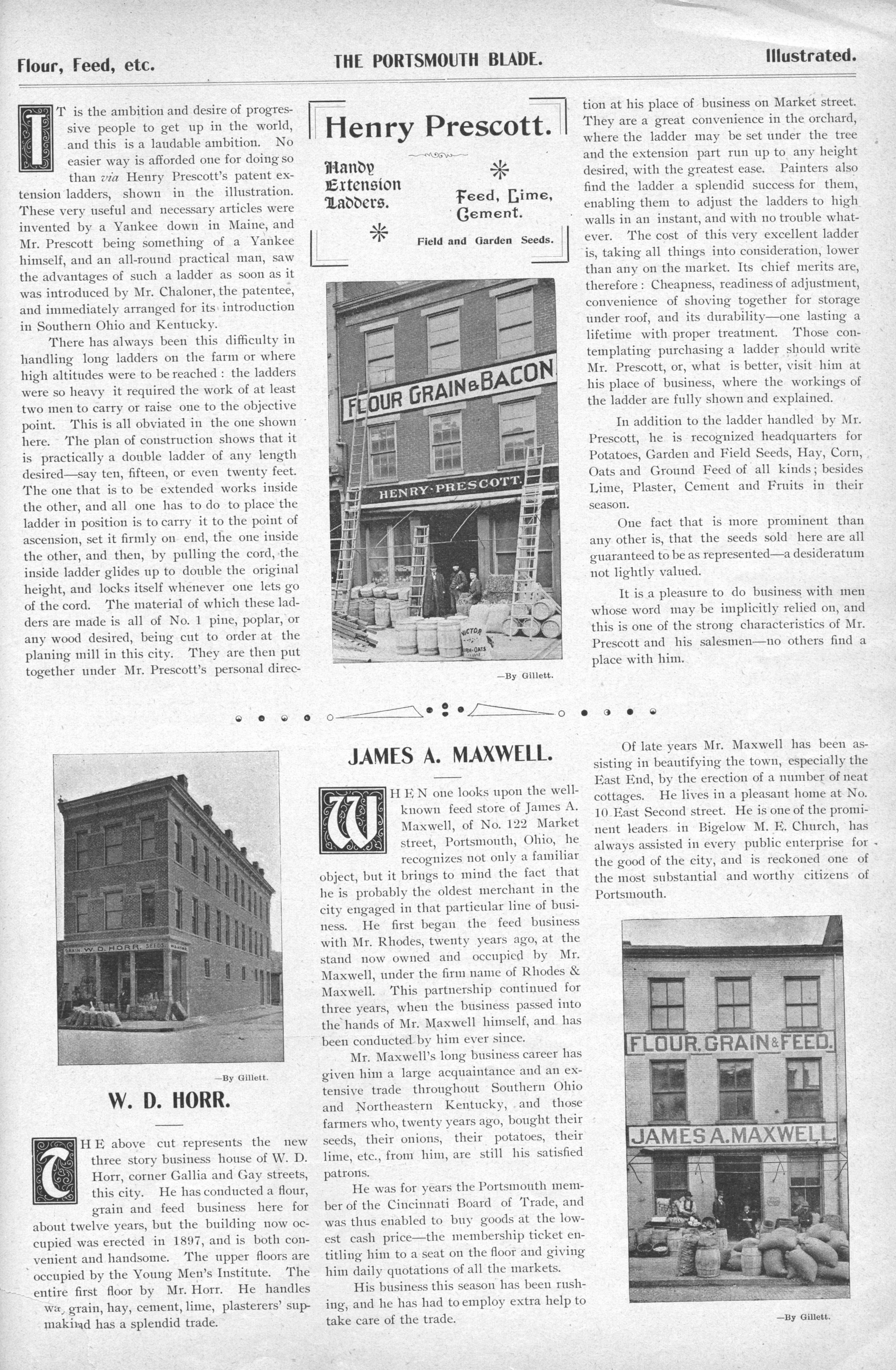 - Black & white scanned images of the Henry Prescott business, W. D. Horr business, and James A. Maxwell business.