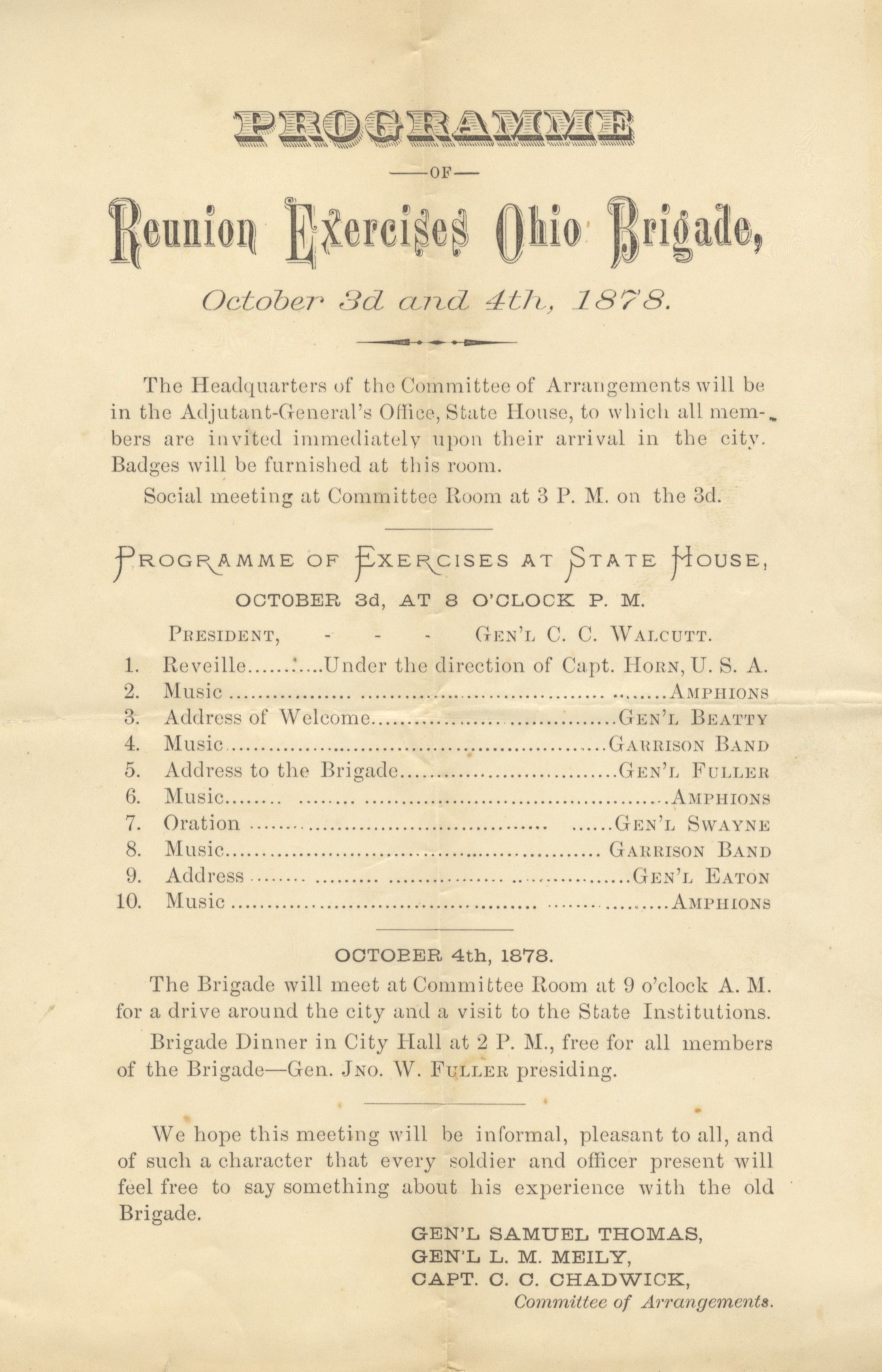 - Programme of the Reunion Exercises of the Ohio Brigade held on October 3rd and 4th in 1878. Exercises were held at the State House at 8 pm.