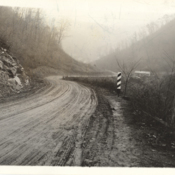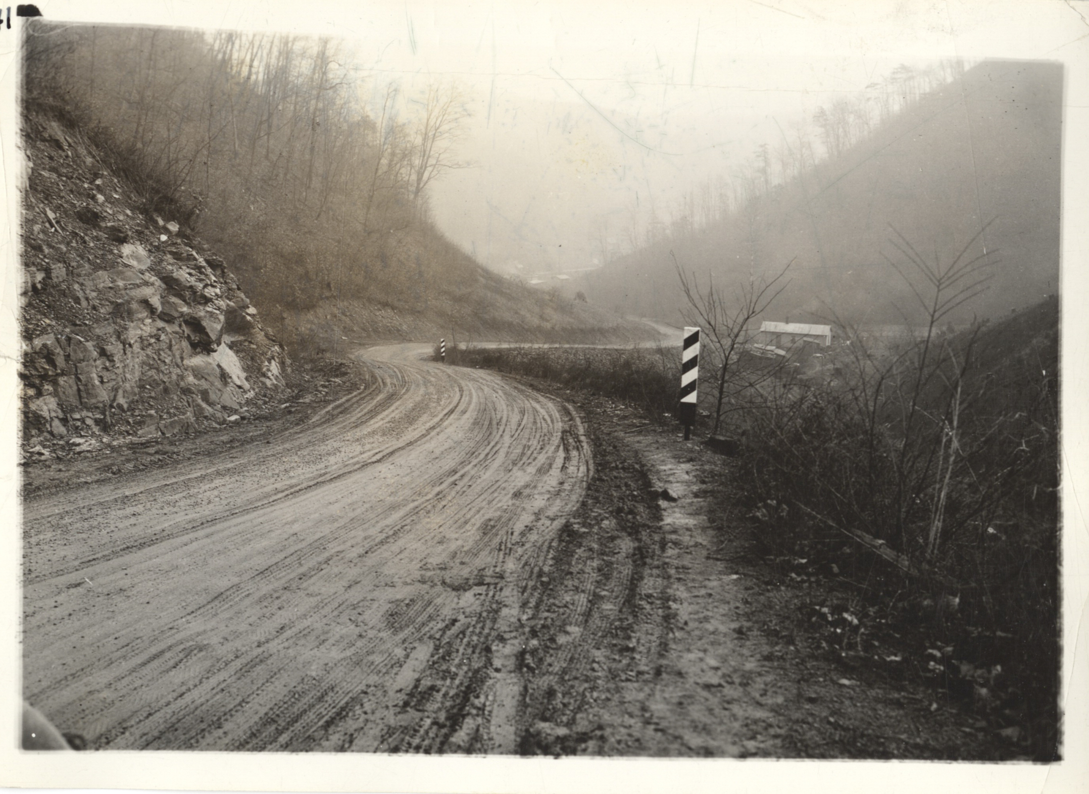 - Black & white photo of the only way out-Scherer's Hollow Road after flood damage in 1937 flood.