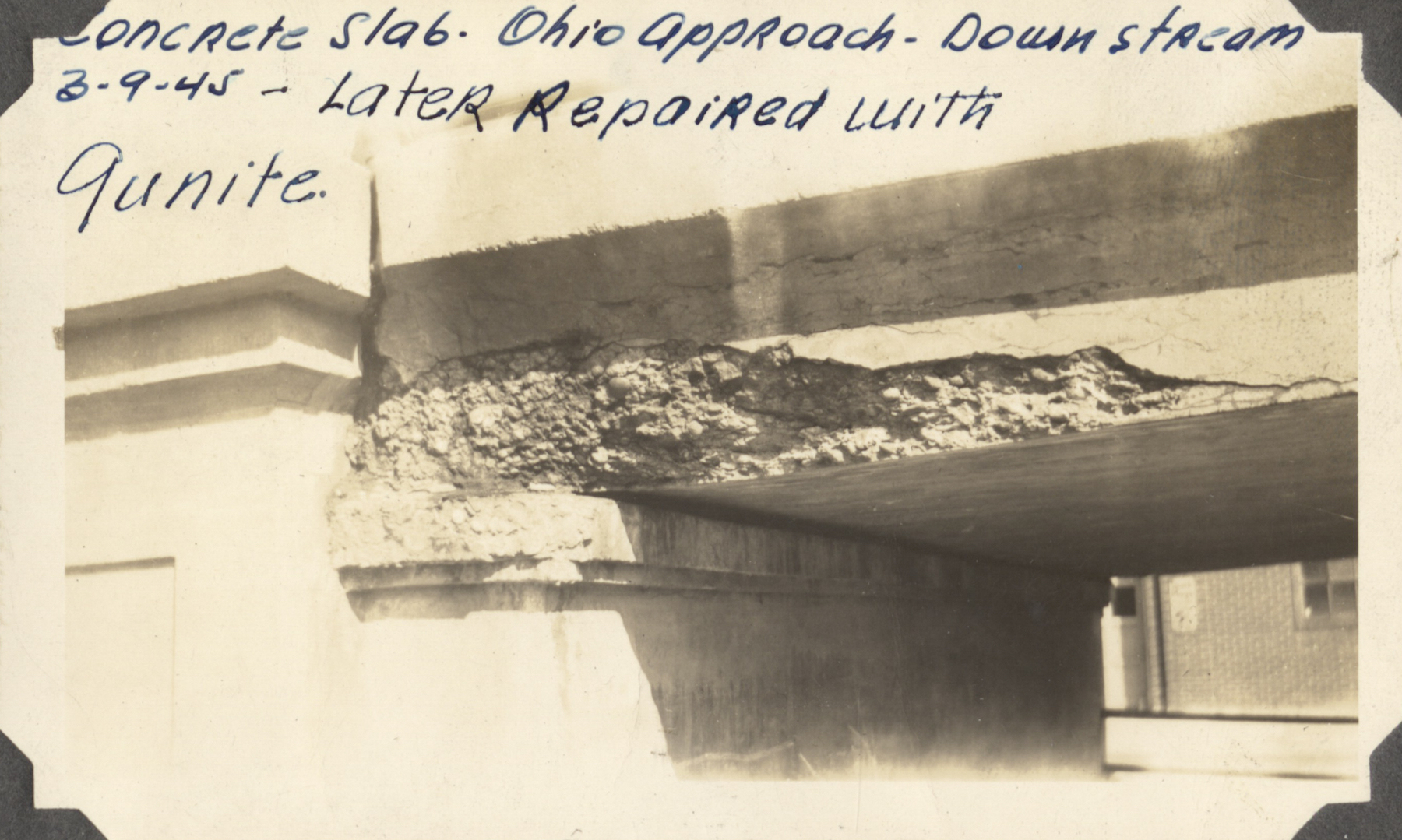 - "Concrete slab Ohio approach - downstream. 3-9-45 - later repaired with gunite."