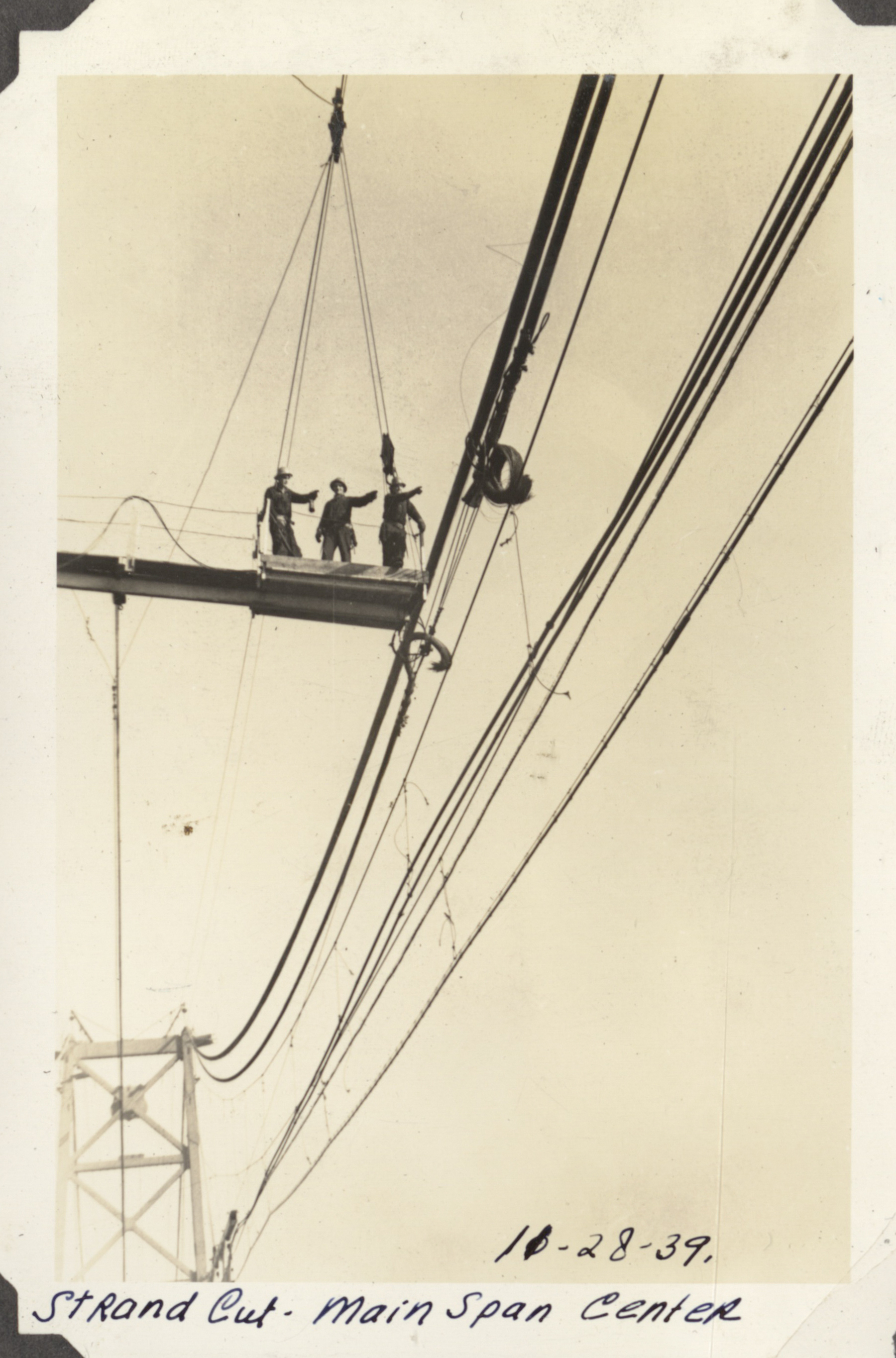 - "Strand cut - main span center 11-28-39" three workers seem to be pointing