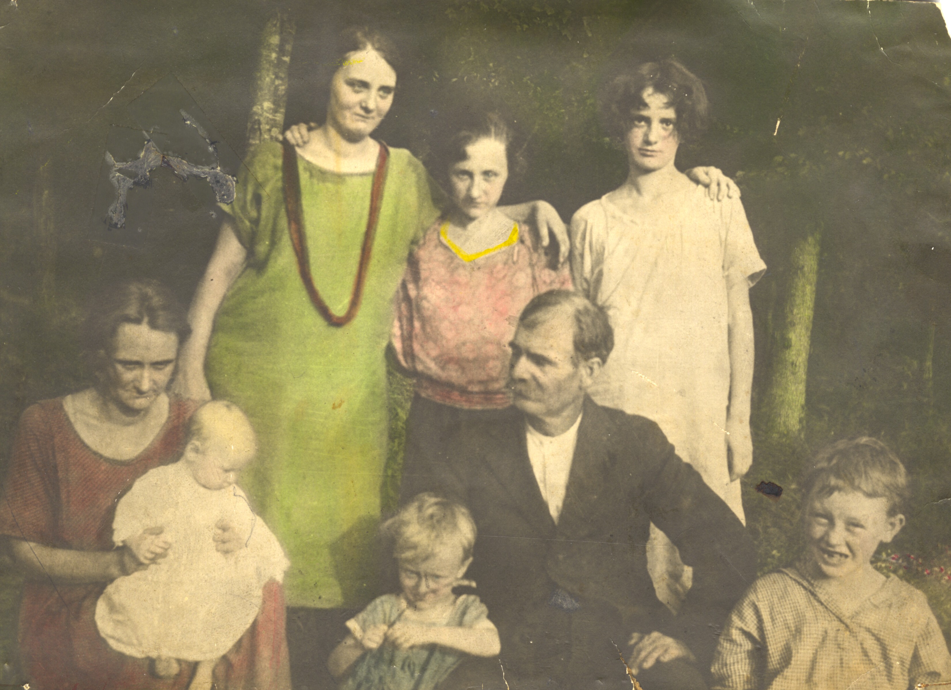 Written on back: Sitting, Mom (Icy Faulkner) with Ruth York on lap, Frank Faulkner, little boy Ora, larger boy Elba, Ethel Faulkner Stephenson, Myrtle Faulkner York & Ollie Faulkner York. - Creator