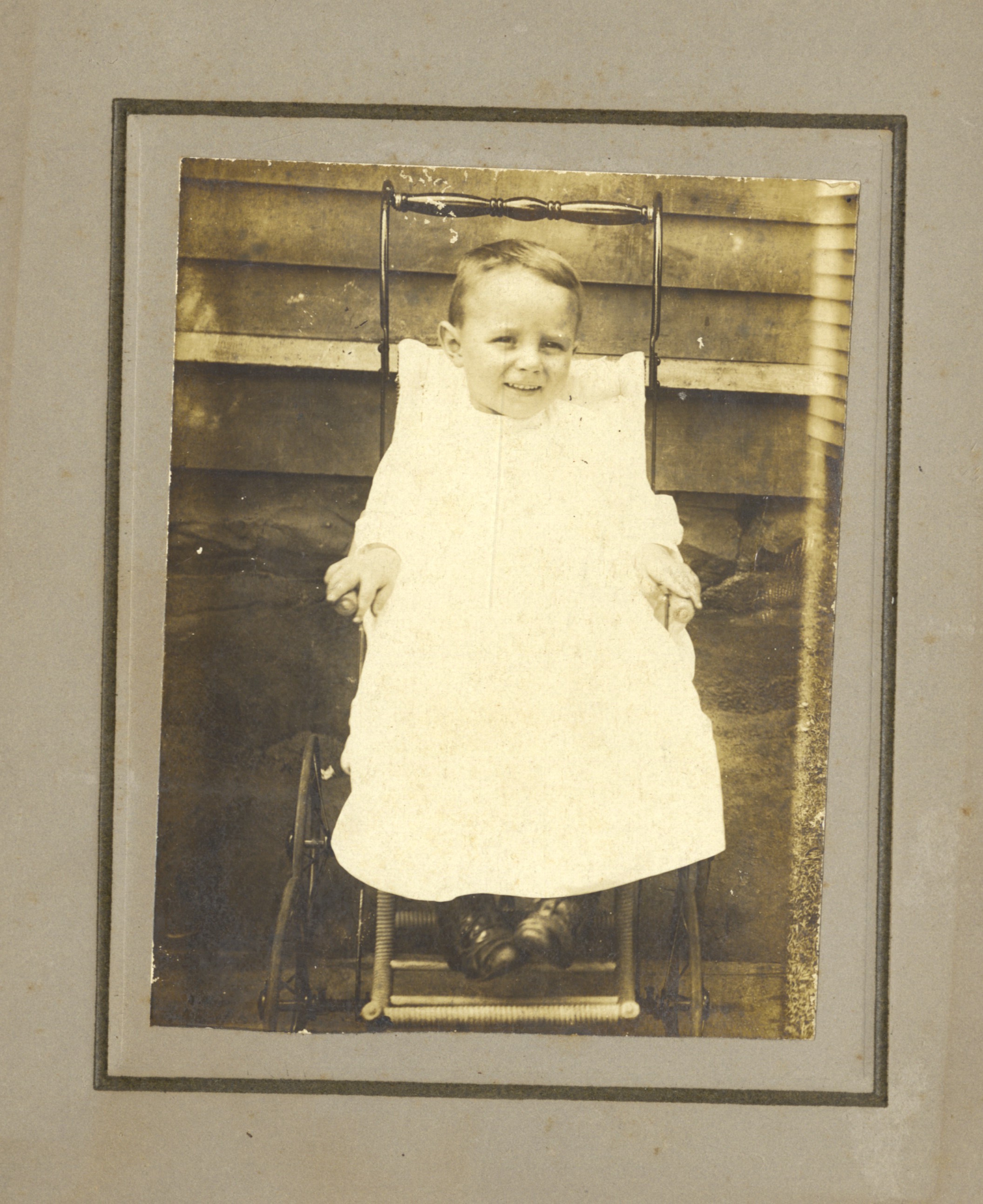 - Black and white photo of an unknown child, presumably a member of the Wente family. Photo is attached to grey matboard.