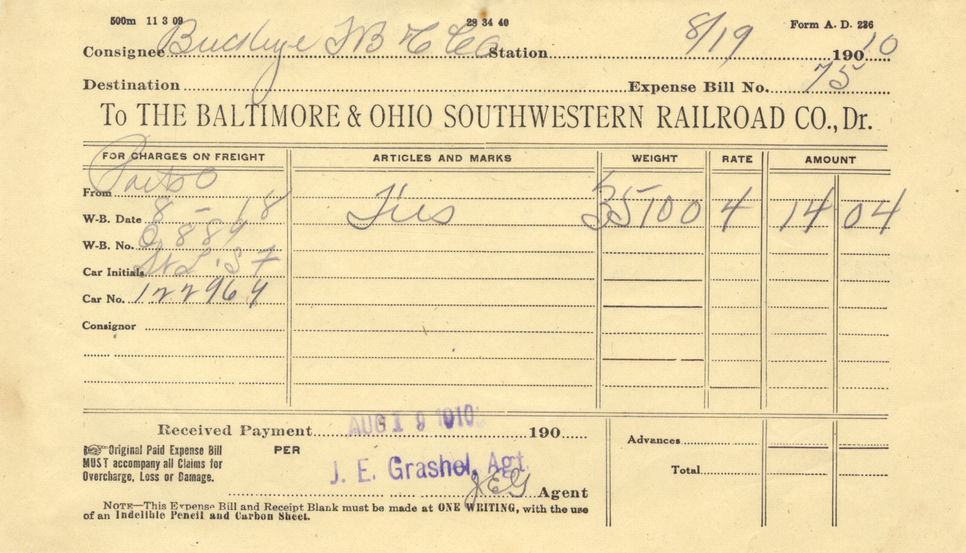 - Expense bill and receipt from 1910. Stamped and initialed, J.E. Grashel, agent.