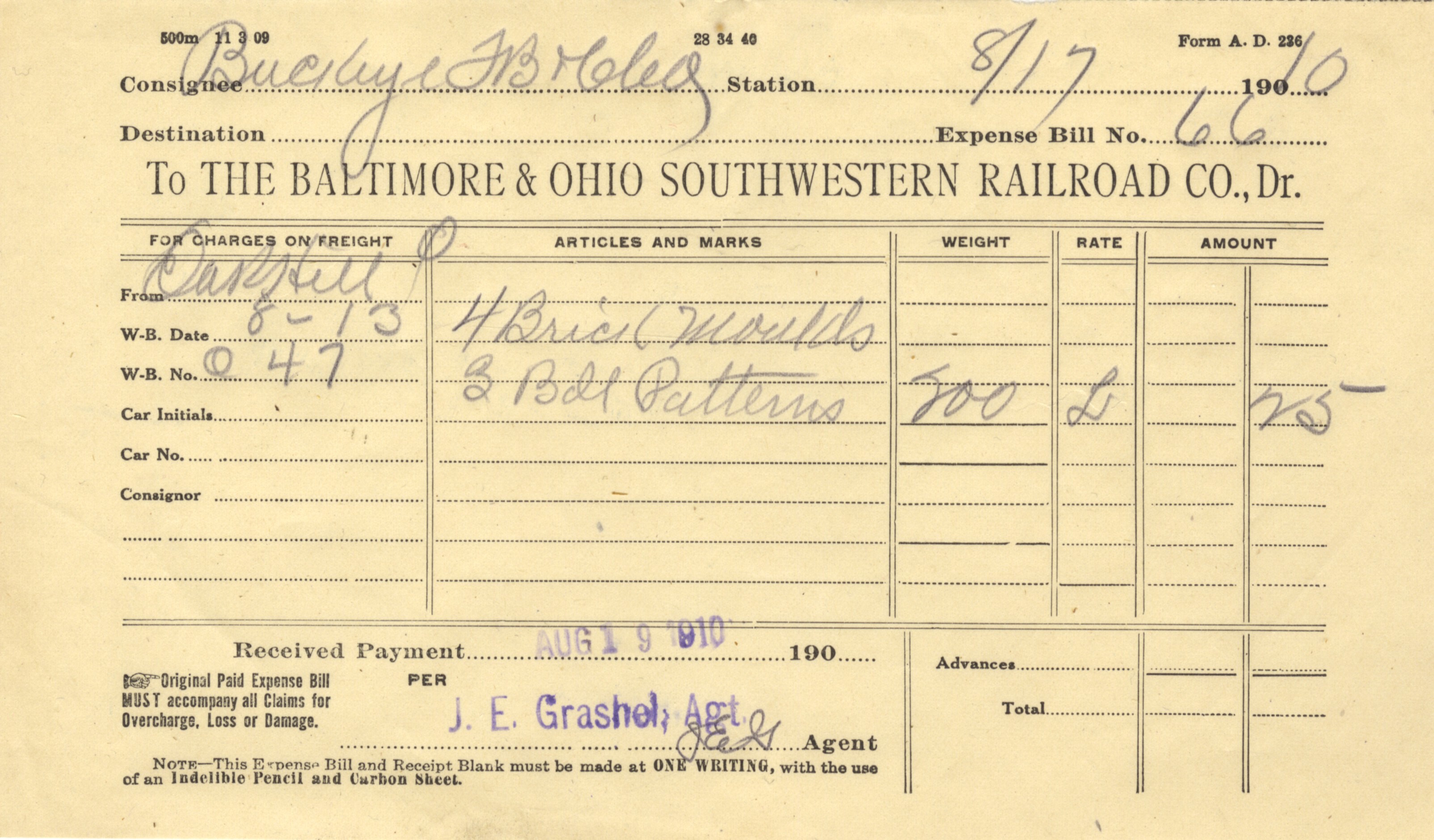 - Expense bill and receipt from 1910. Stamped and initialed, J.E. Grashel, agent.