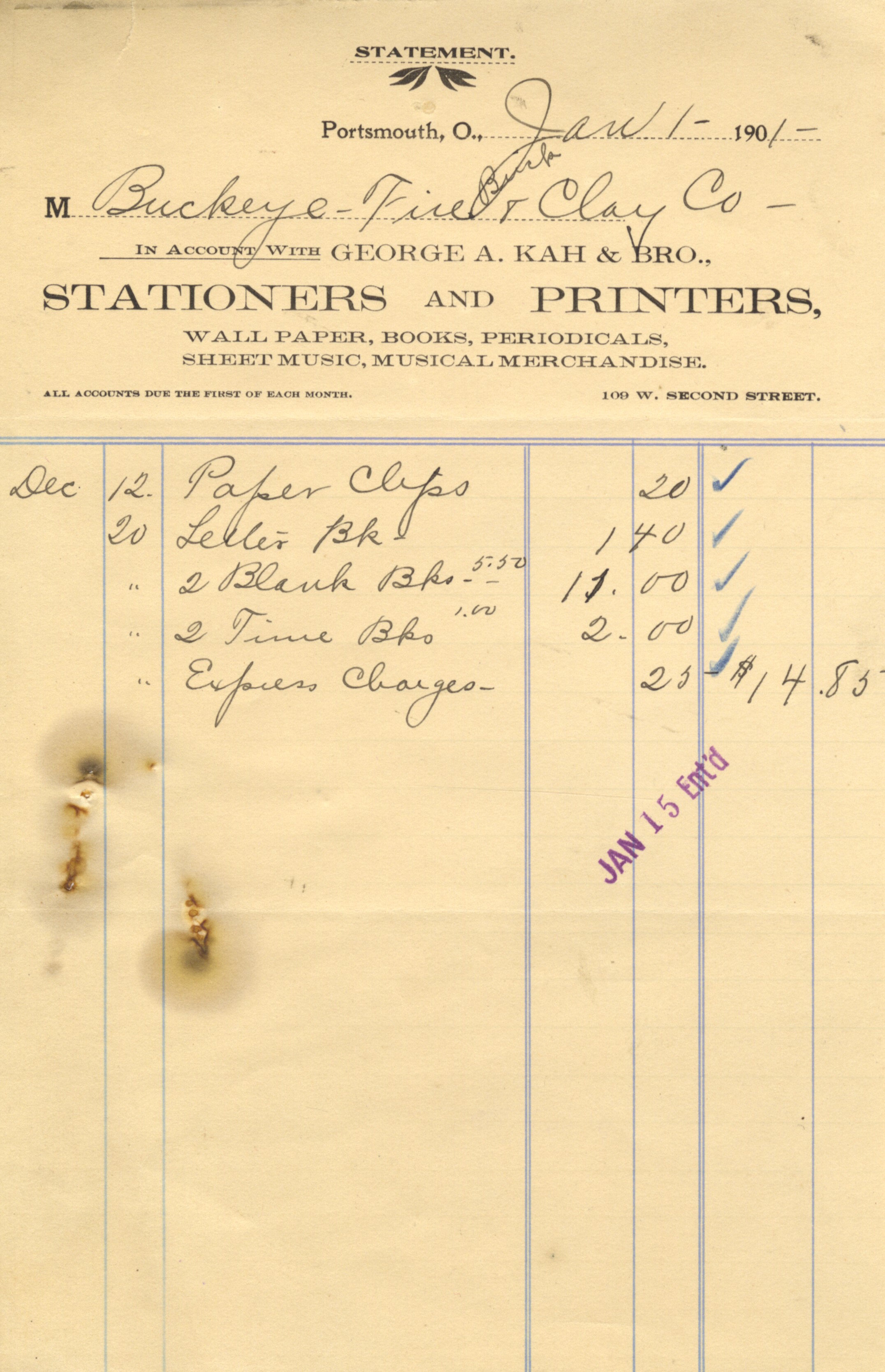 - Paper invoice to Buckeye Fire Brick & Clay Co., for office supplies