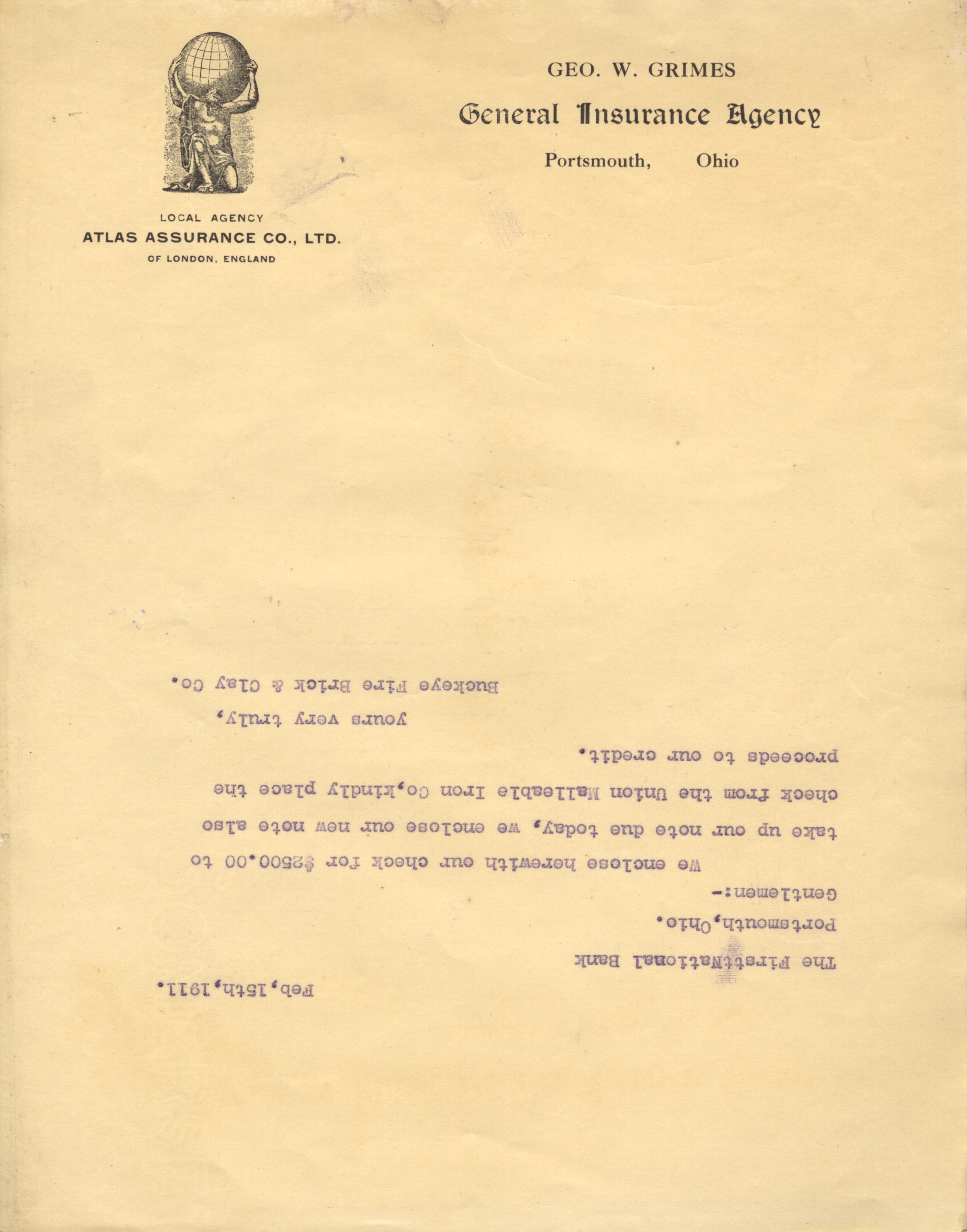 - Typed letter from Buckeye Fire Brick & Clay Co., to The First National Bank on General Insurance Agency letterhead.