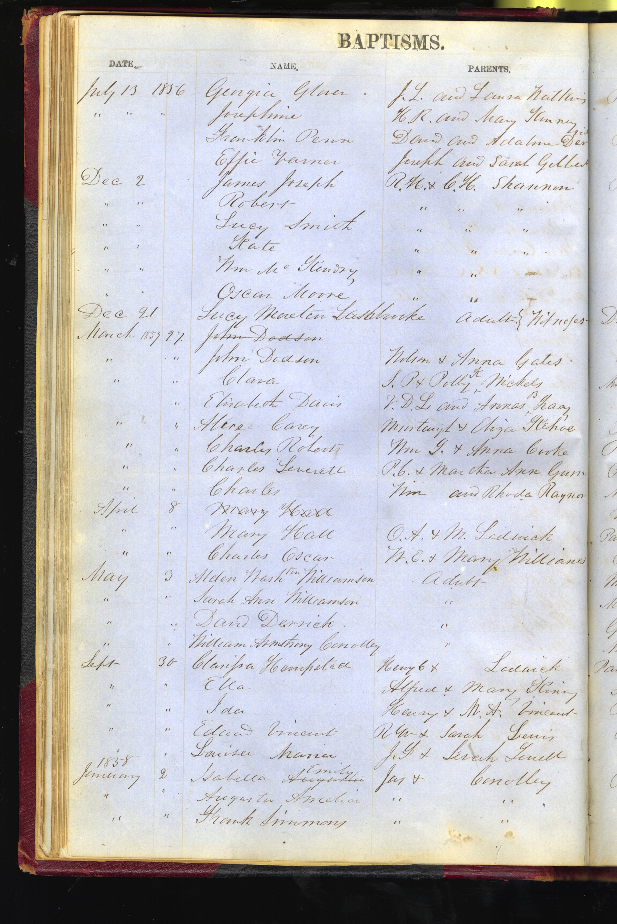 - scan of cursive written page of the Parish register for All Saints Church, Portsmouth, Ohio. Listed are the baptisms.