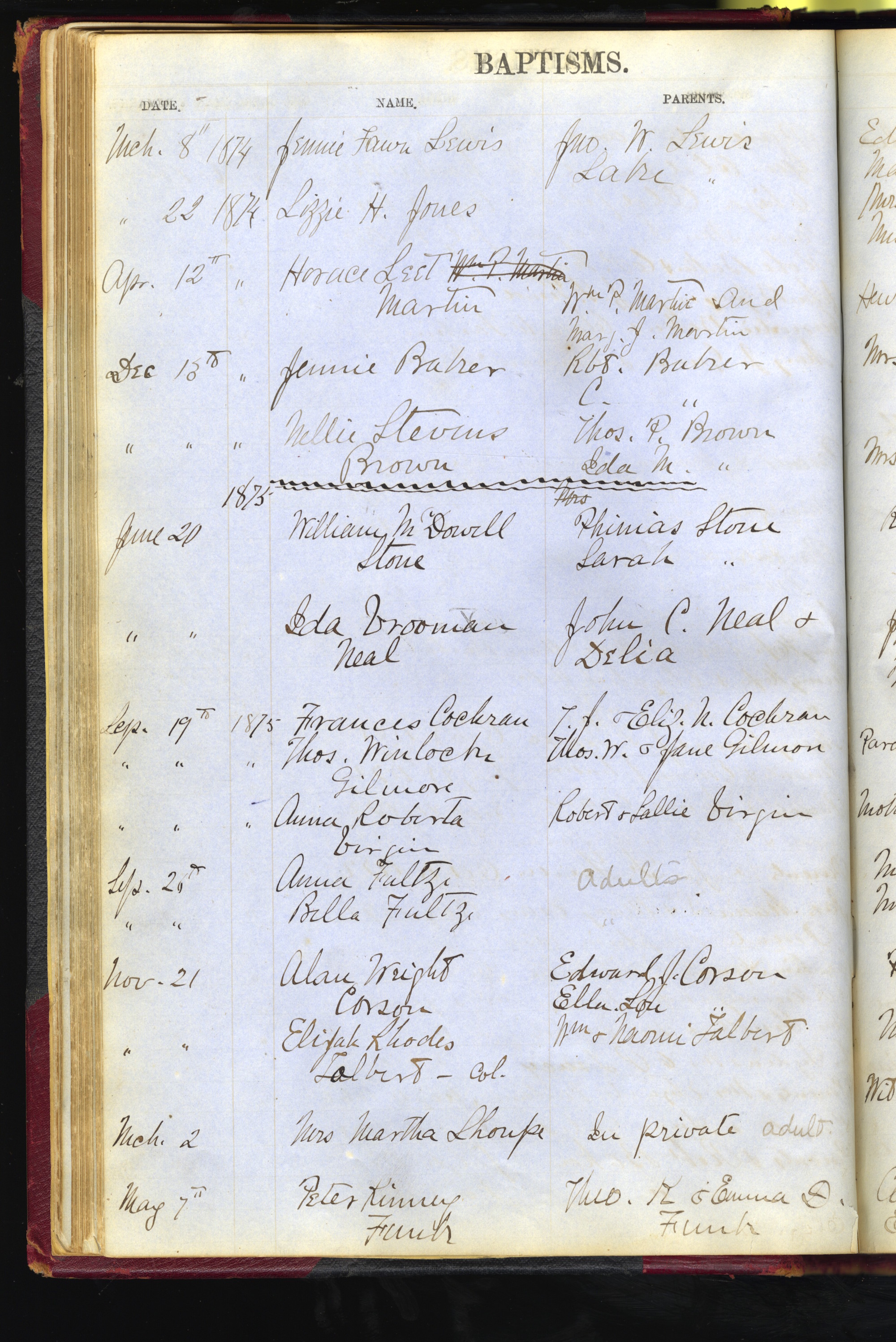 - scan of cursive written page of the Parish register for All Saints Church, Portsmouth, Ohio. Listed are the baptisms.