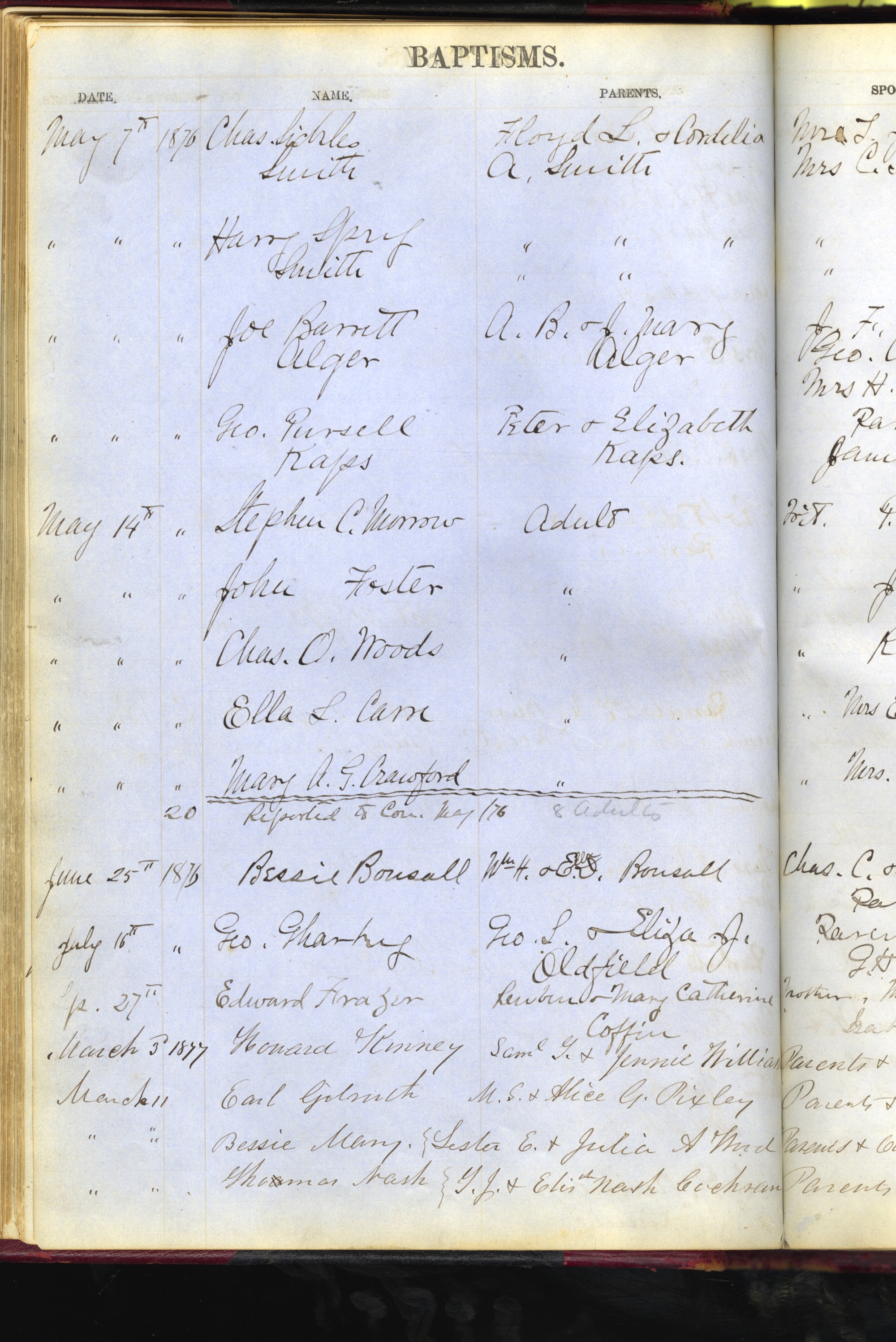 - scan of cursive written page of the Parish register for All Saints Church, Portsmouth, Ohio. Listed are the baptisms.