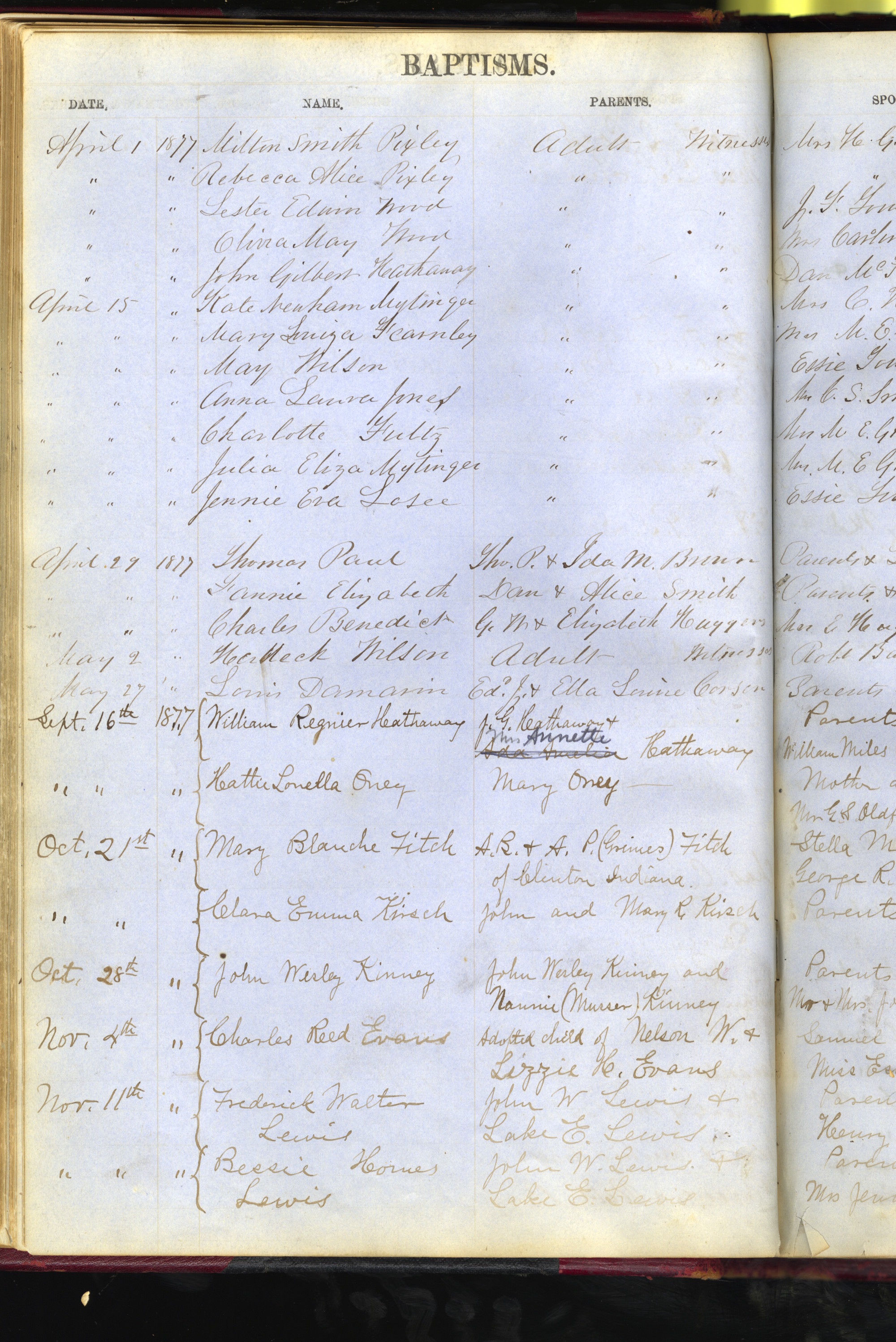 - scan of cursive written page of the Parish register for All Saints Church, Portsmouth, Ohio. Listed are the baptisms.