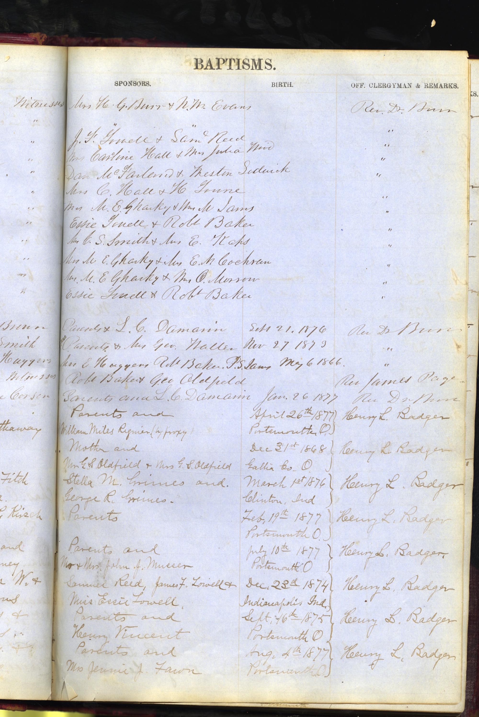 - scan of cursive written page of the Parish register for All Saints Church, Portsmouth, Ohio. Listed are the baptisms.