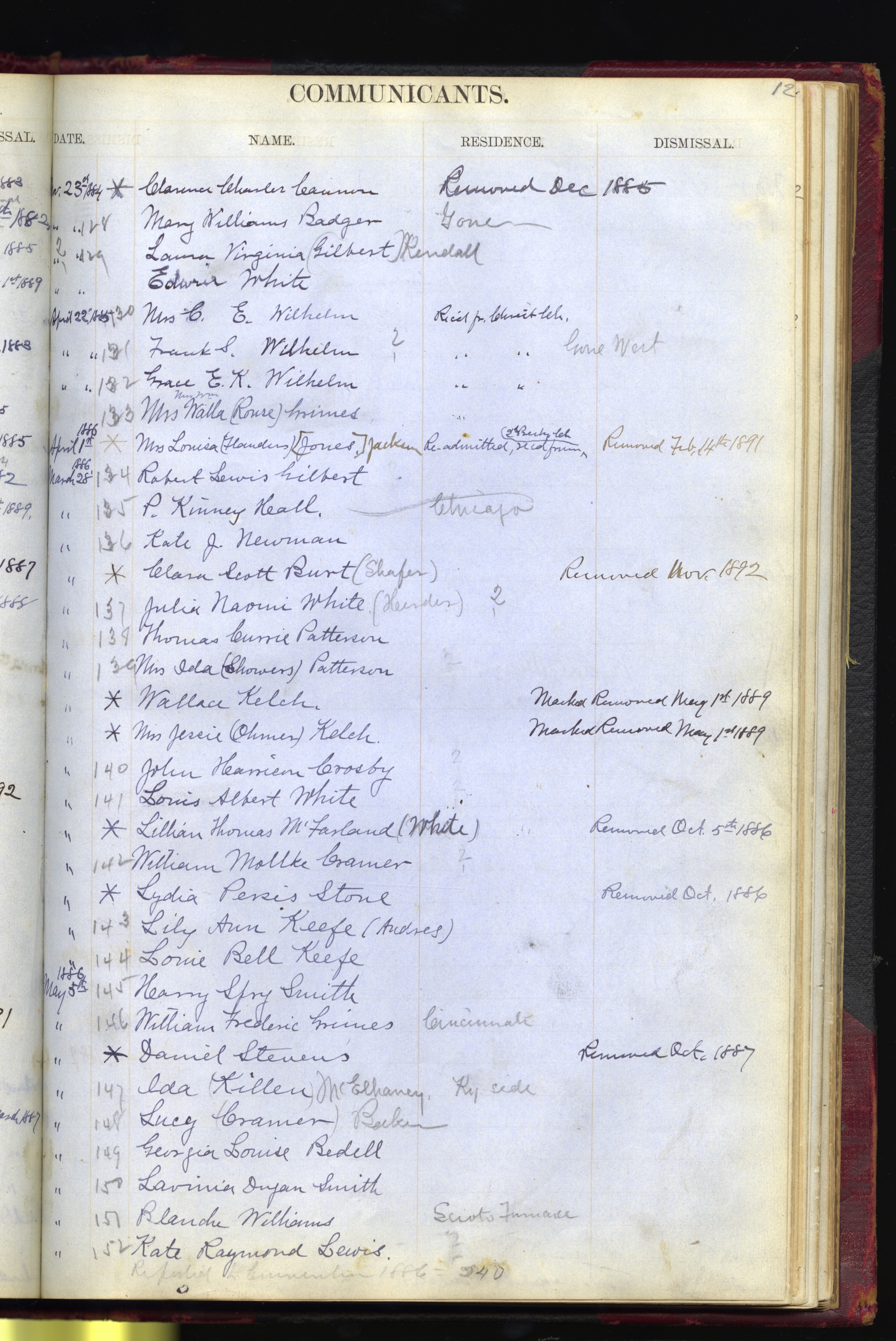 - scan of page from All Saints Church Ledger. Shown is typed title at top of page "communicants" with handwritten names, dates, residences, and dismissals listed beneath.