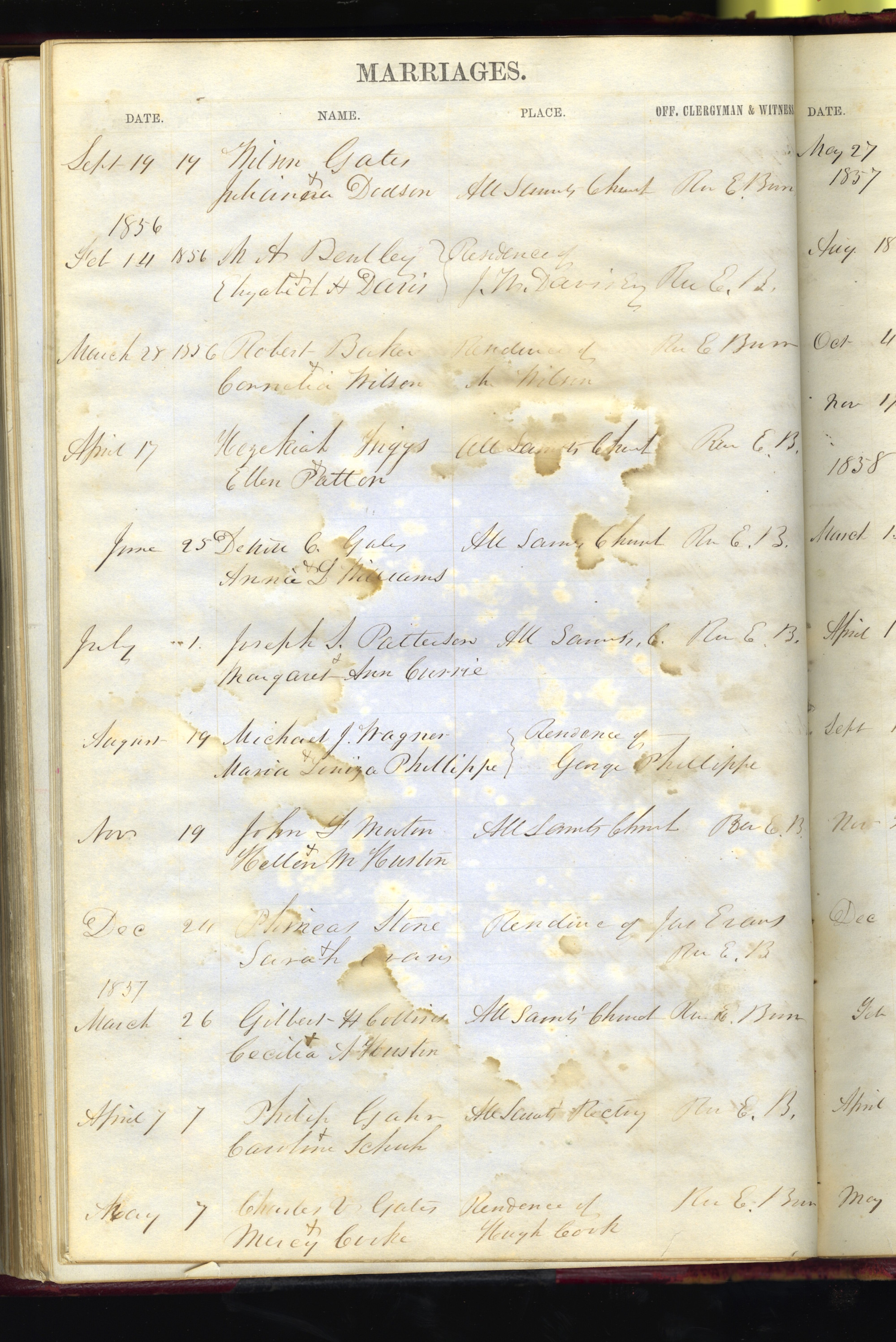 - scan of page from All Saints Church Ledger. Shown is typed page titled "marriages" with handwritten names, dates, places, and witnesses listed beneath.