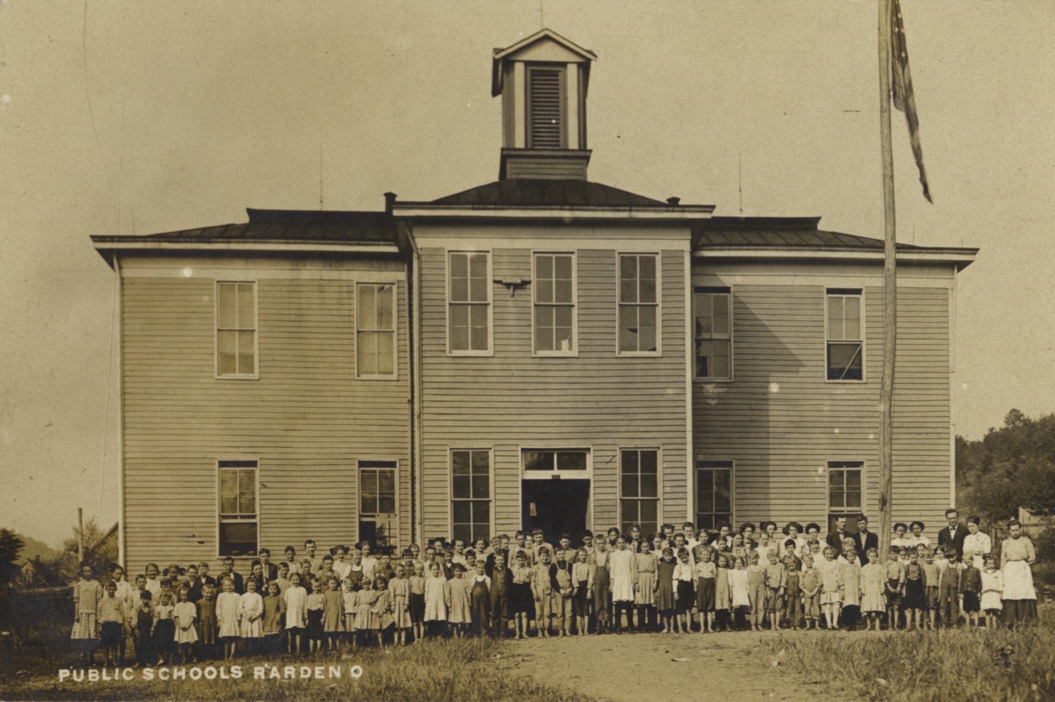 - Black & white photograph image of building with faculty & students. This two-story frame building was built about 1900 on the east end of Rarden on lots 72 & 73.