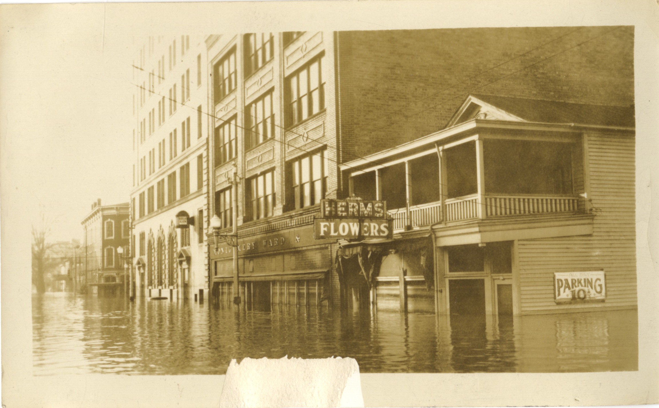 - Black & white photograph taken during the 1937 Flood. Herms Floral Company, 817 Sixth (6th) Street. Handwritten on back: Water had receded several inches when this was taken.