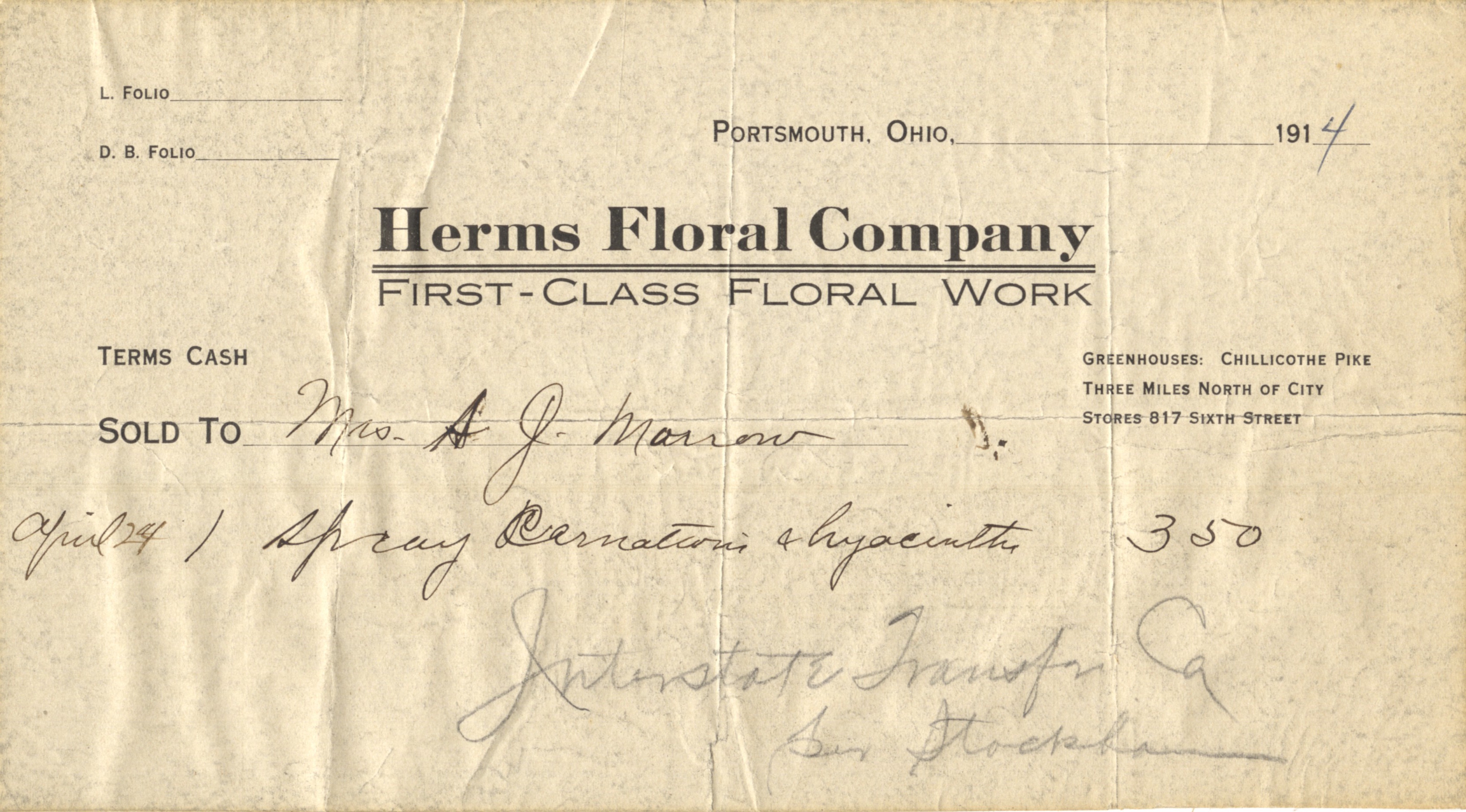 Receipt for flower order,” Scioto County Public Library Local History Digital Collection, accessed December 5, 2025, https://www.sciotolibrary.org/history/items/show/15748.