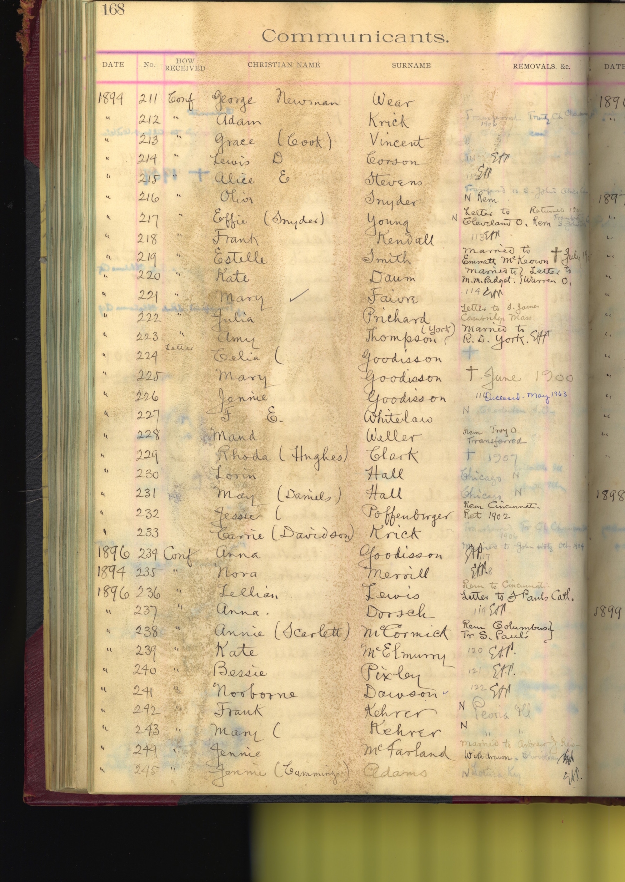 - scan of page from All Saints Church Ledger. Shown is typed title at top of page "communicants" with handwritten information listed in rows beneath.