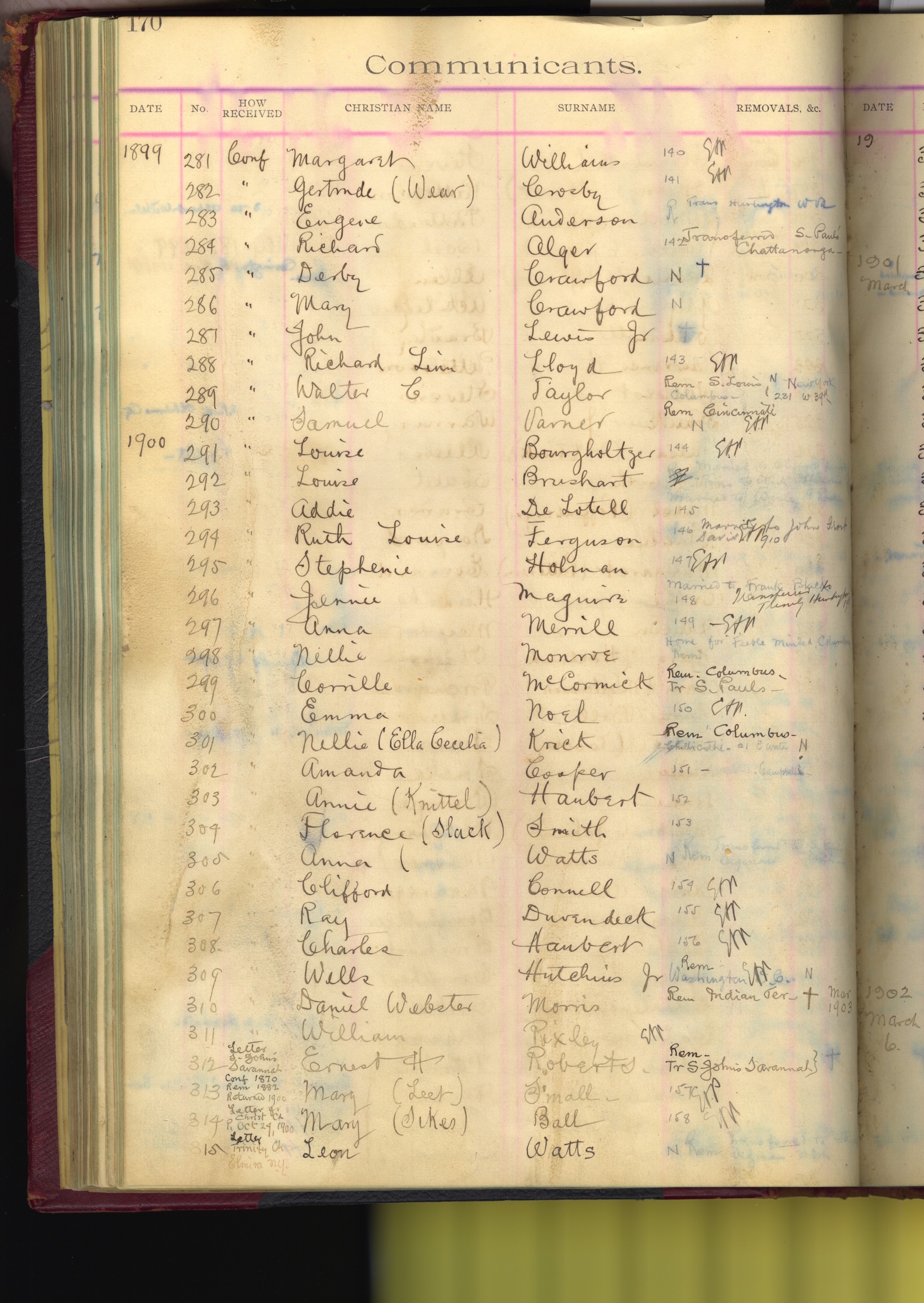 - scan of page from All Saints Church Ledger. Shown is typed title at top of page "communicants" with handwritten information listed in rows beneath.