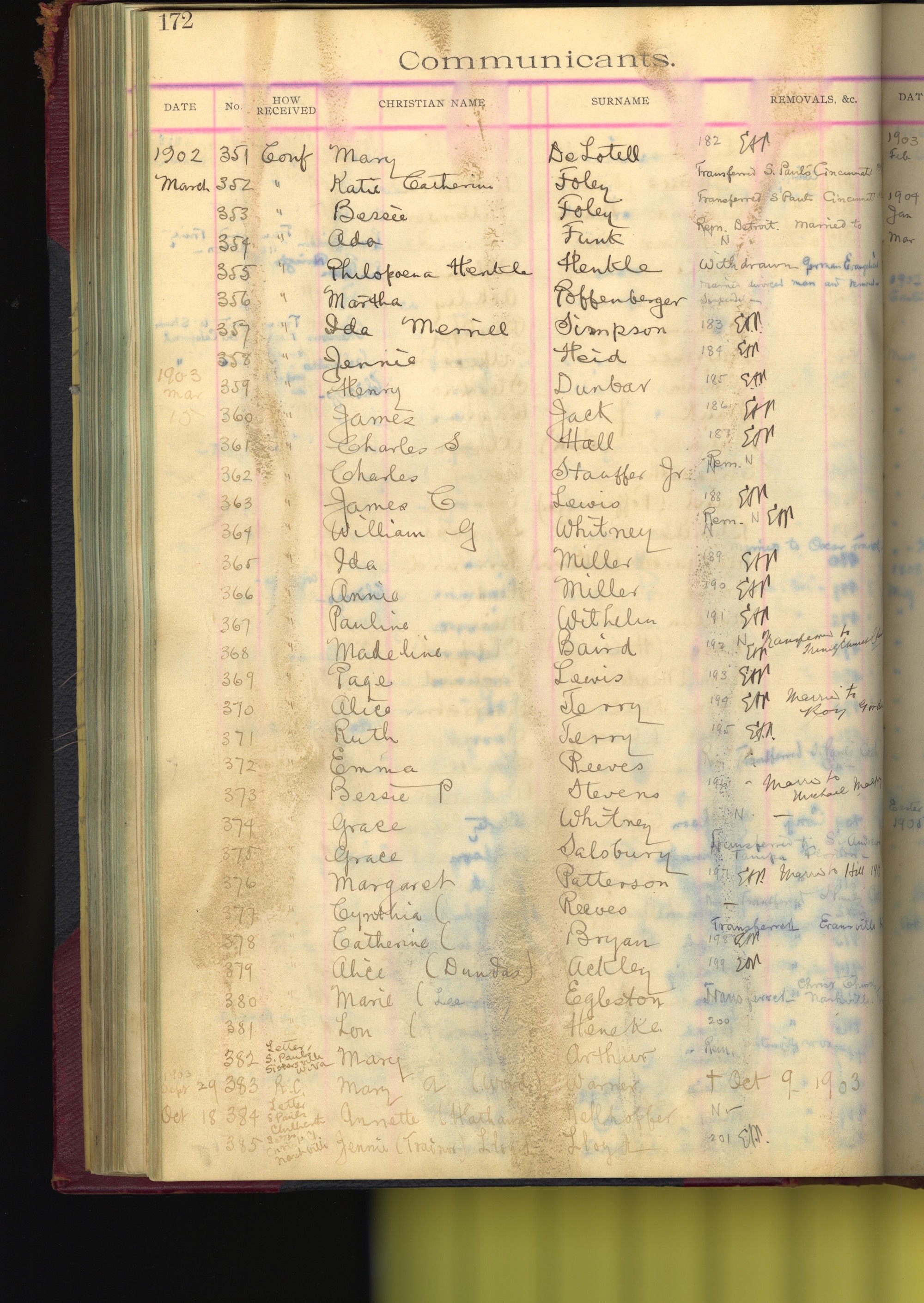 - scan of page from All Saints Church Ledger. Shown is typed title at top of page "communicants" with handwritten information listed in rows beneath.