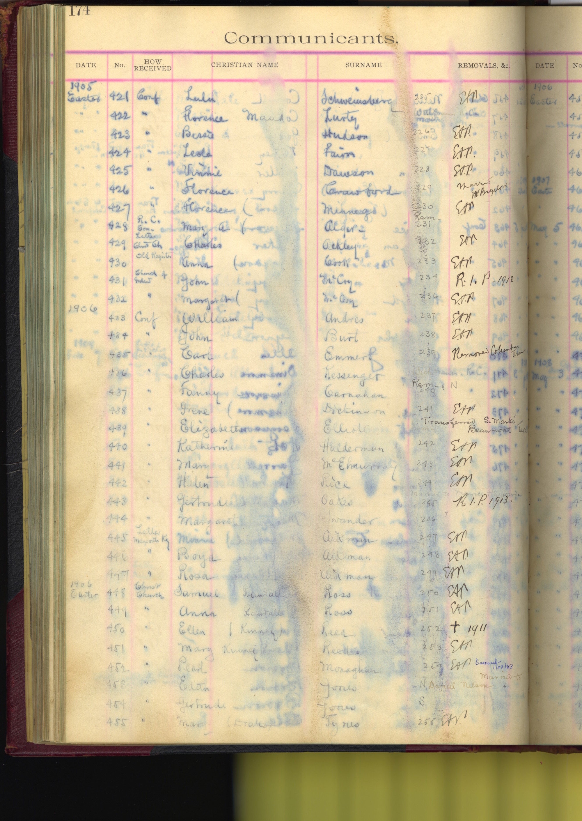 - scan of page from All Saints Church Ledger. Shown is typed title at top of page "communicants" with handwritten information listed in rows beneath.