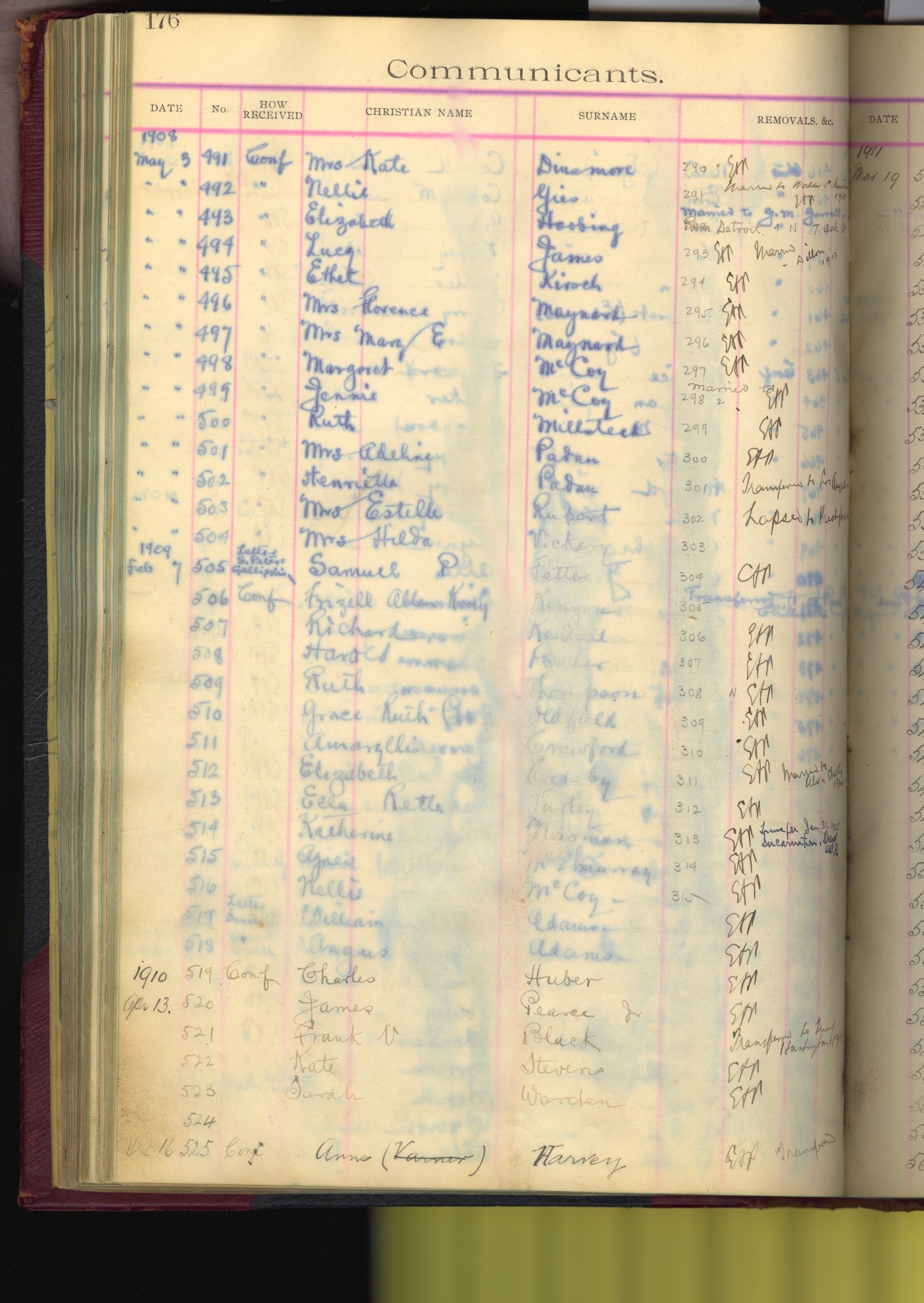 - scan of page from All Saints Church Ledger. Shown is typed title at top of page "communicants" with handwritten information listed in rows beneath.