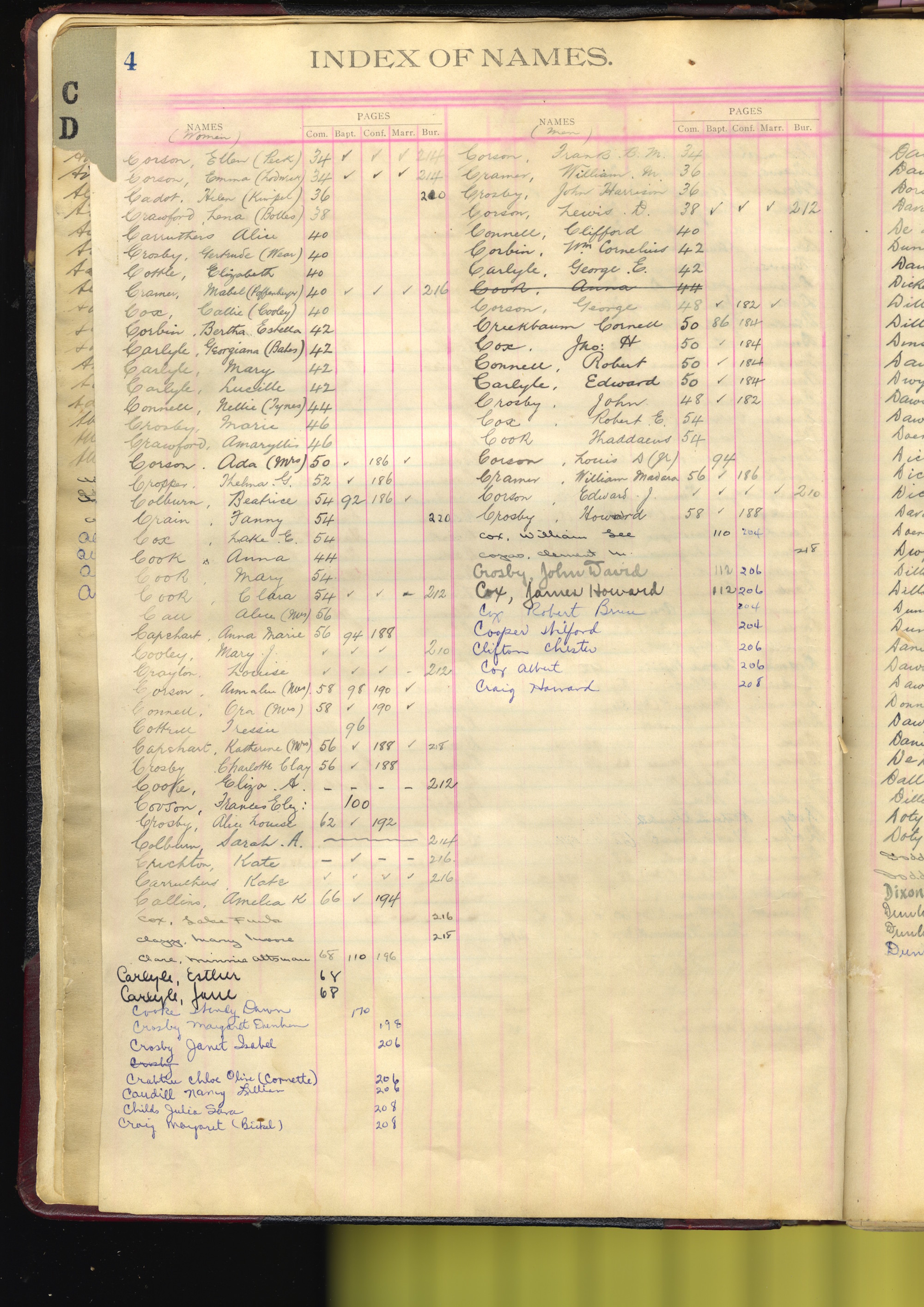- scan of page from All Saints Church Ledger. Shown is typed title at top of page "index of names" with handwritten information listed in rows beneath.