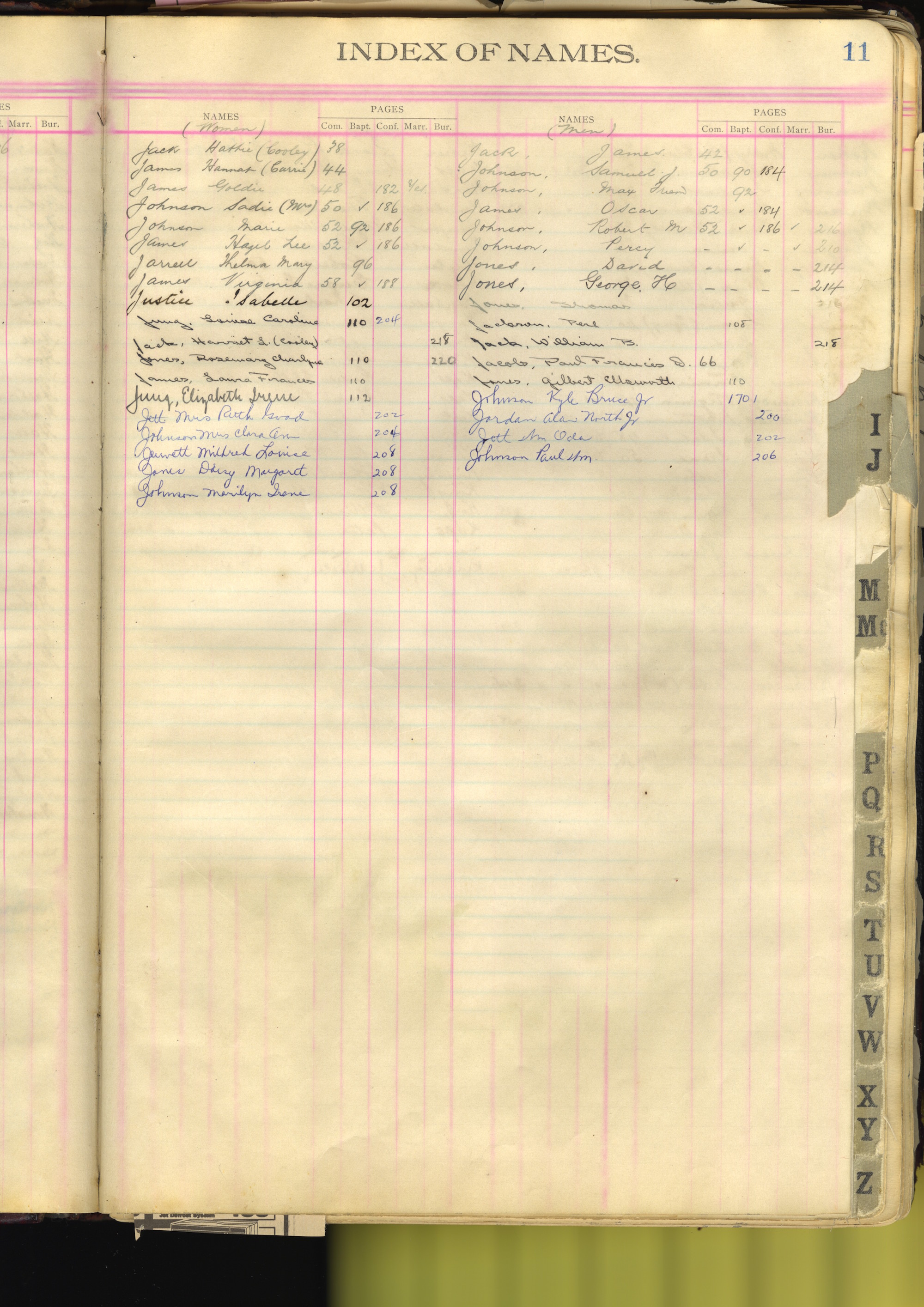 - scan of page from All Saints Church Ledger. Shown is typed title at top of page "index of names" with handwritten information listed in rows beneath.