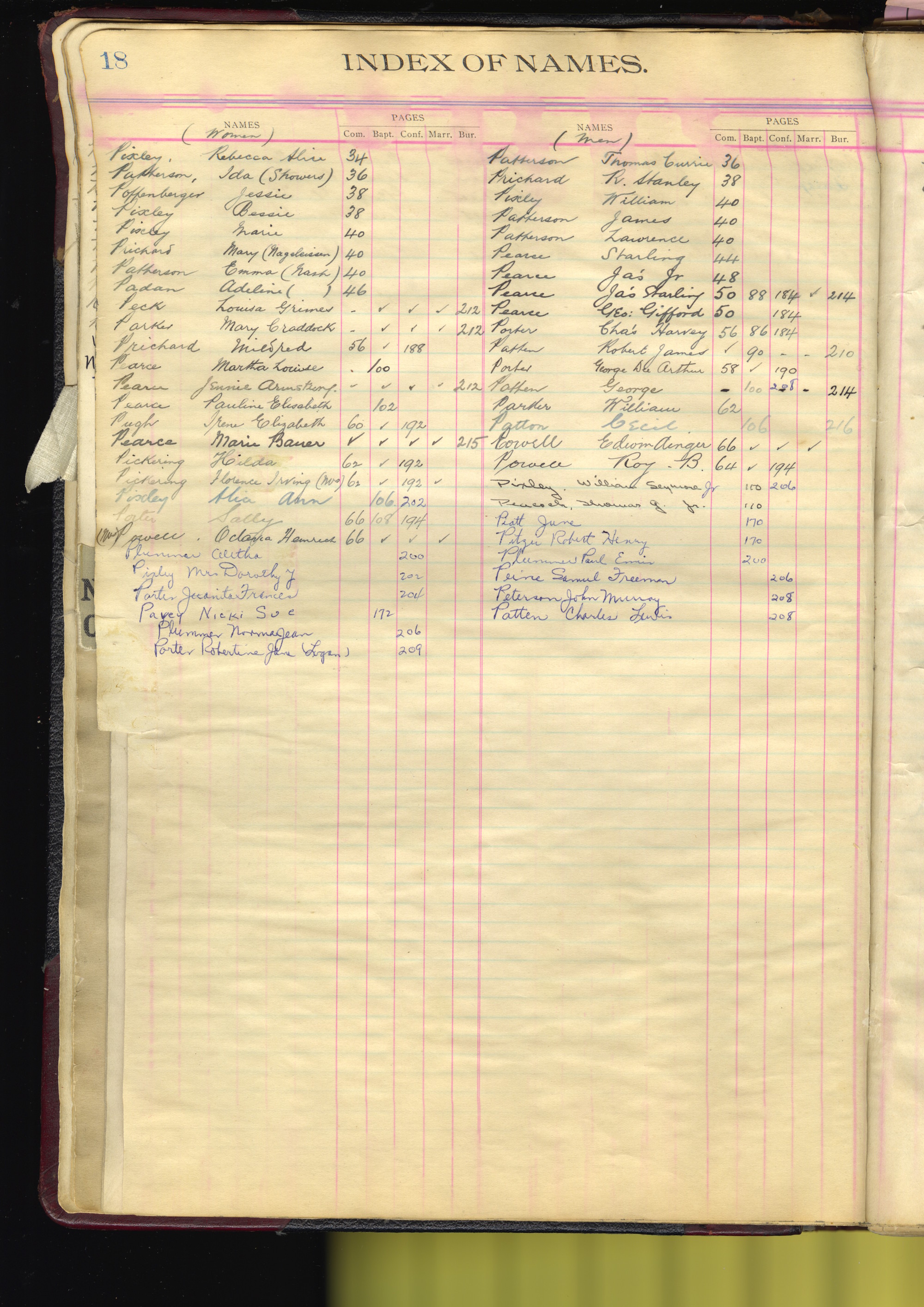 - scan of page from All Saints Church Ledger. Shown is typed title at top of page "index of names" with handwritten information listed in rows beneath.