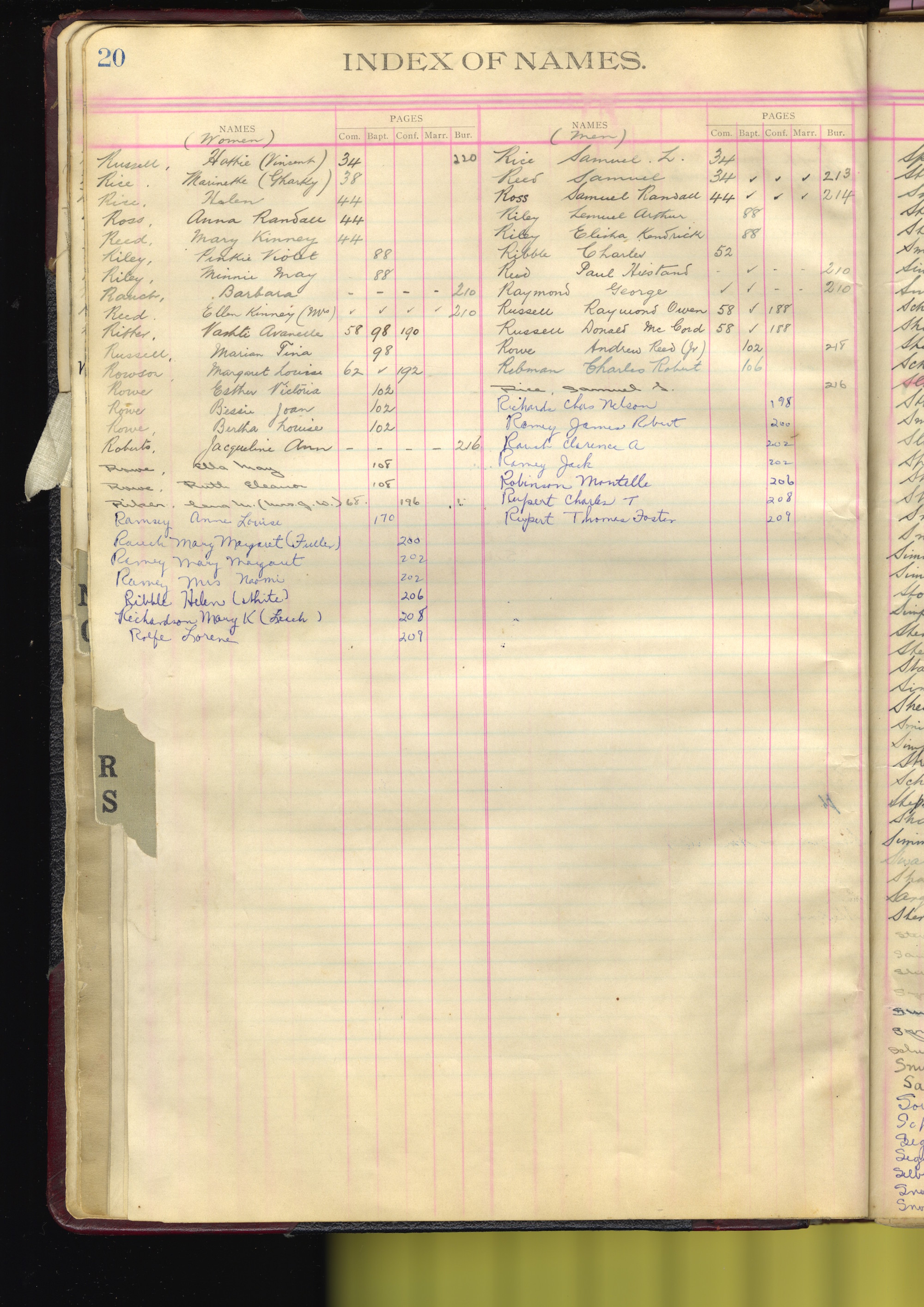 - scan of page from All Saints Church Ledger. Shown is typed title at top of page "index of names" with handwritten information listed in rows beneath.