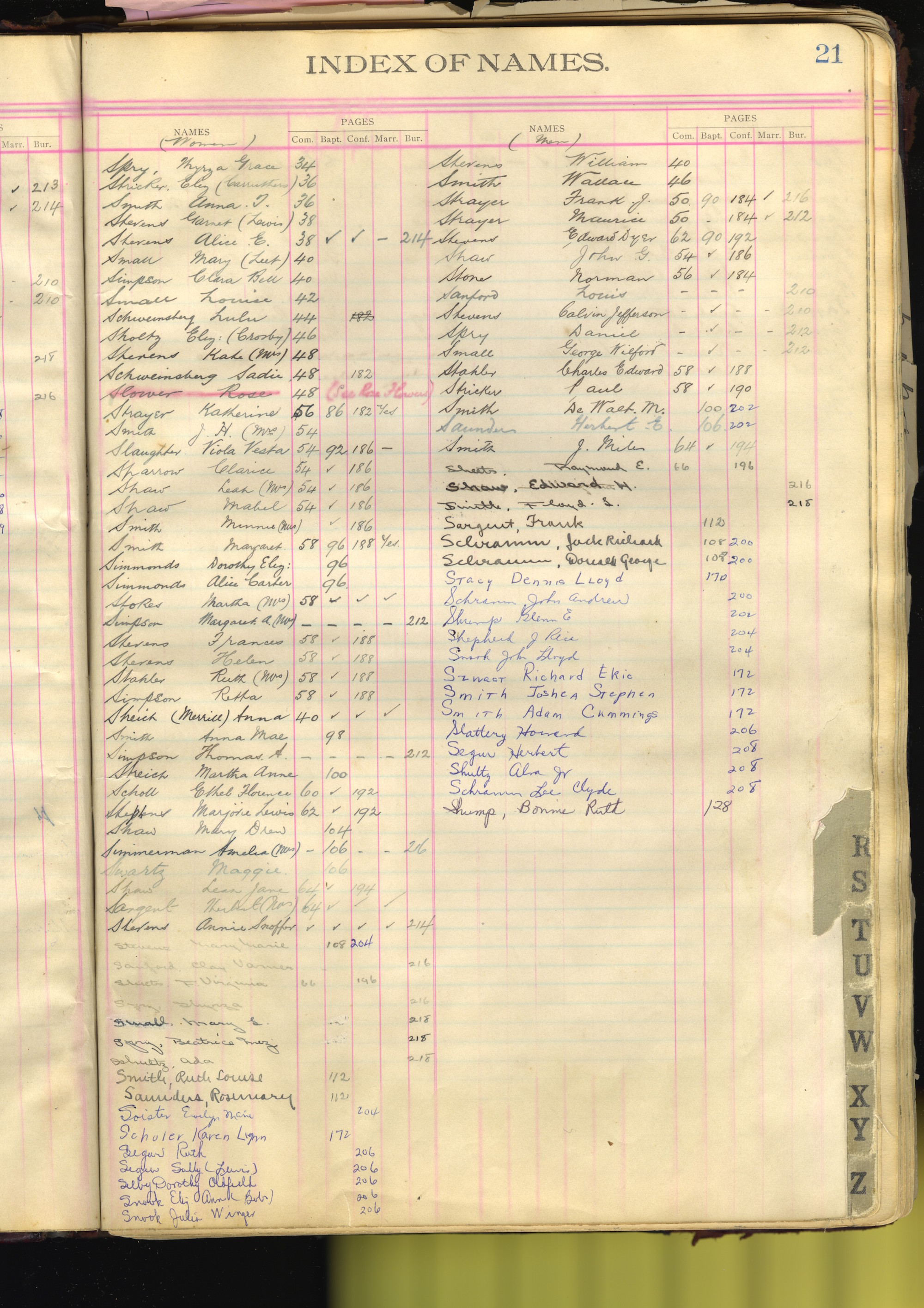 - scan of page from All Saints Church Ledger. Shown is typed title at top of page "index of names" with handwritten information listed in rows beneath.