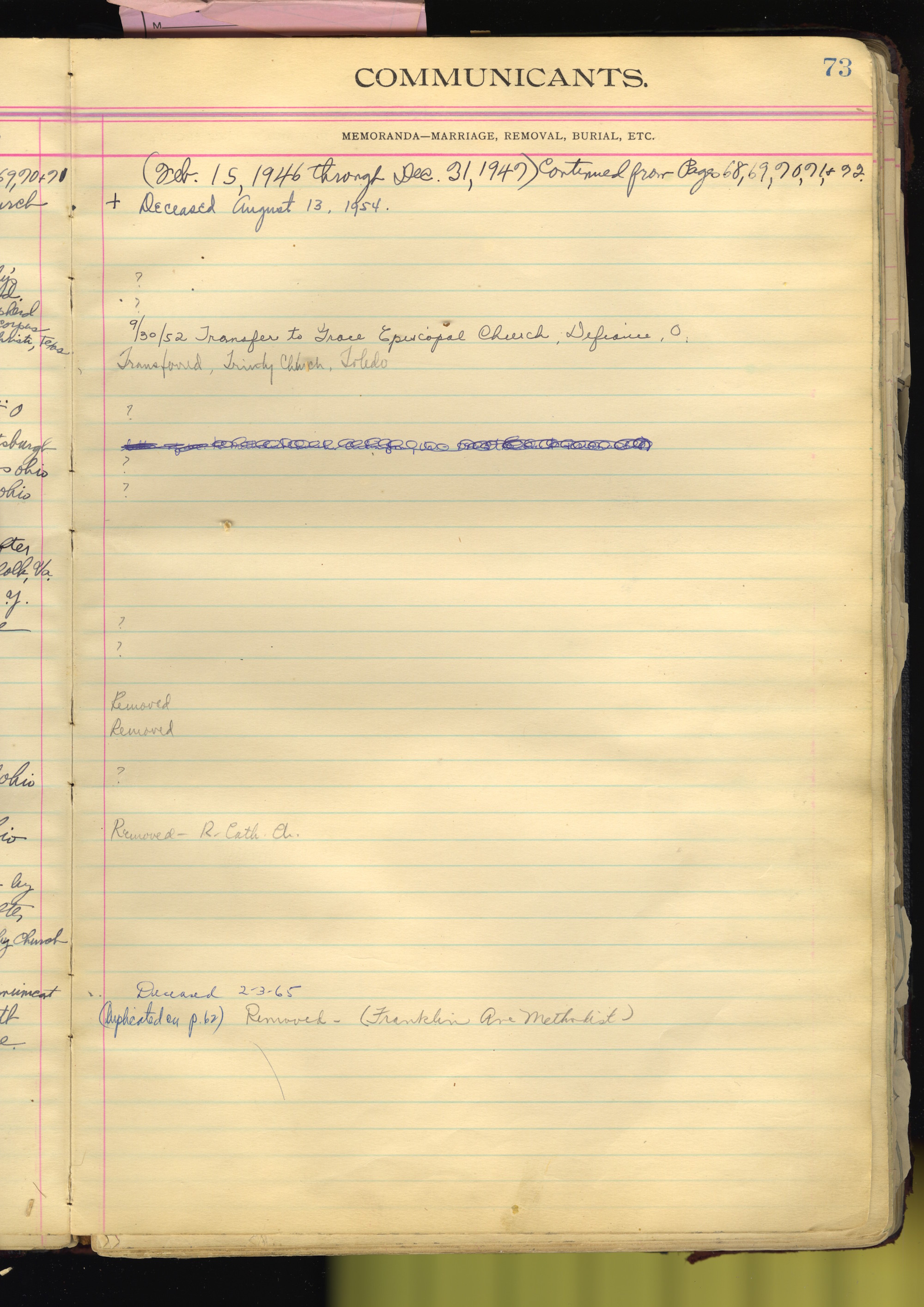 - scan of page from All Saints Church Ledger. Shown is typed title at top of page "communicants" with handwritten information listed in rows beneath.