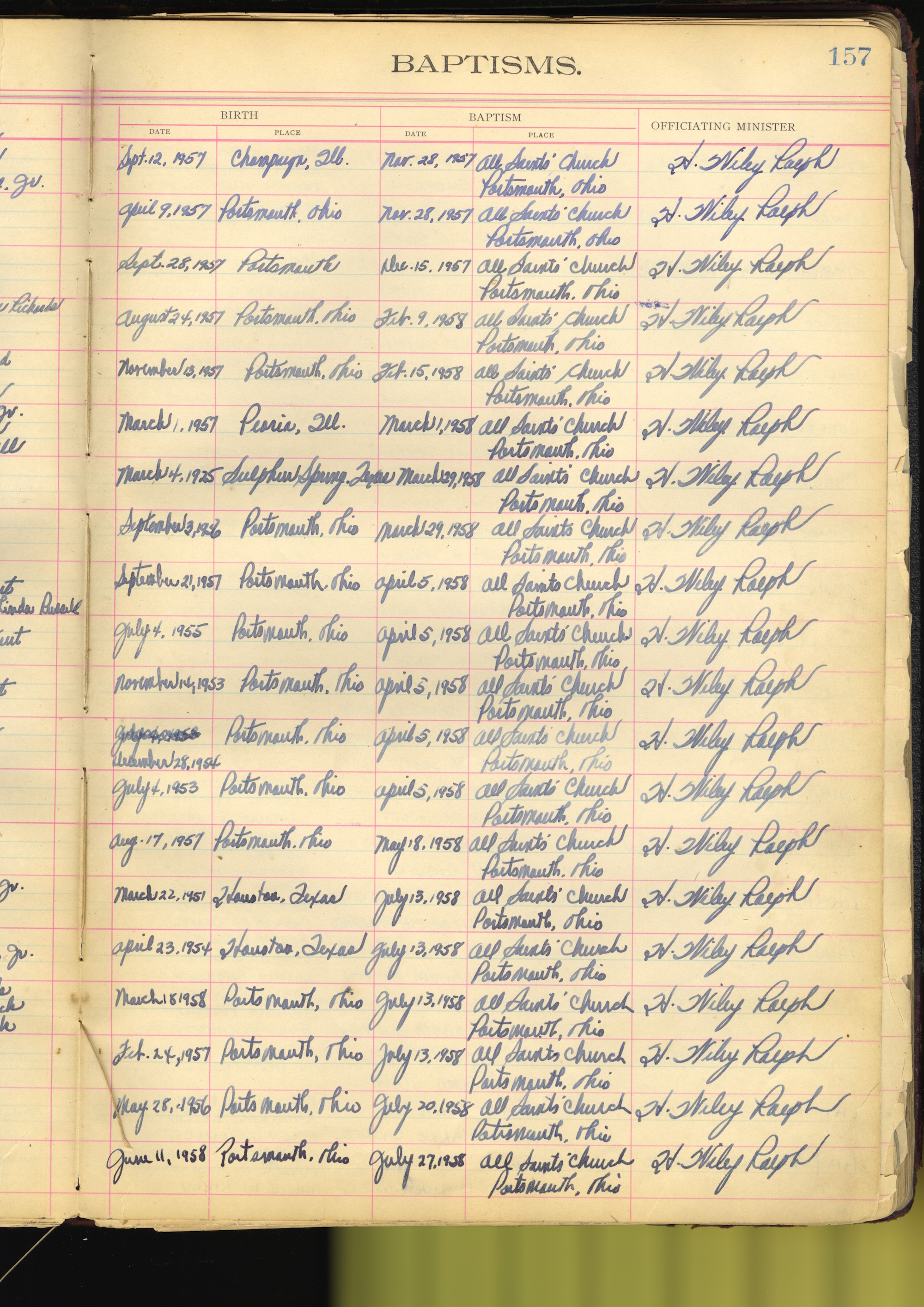 - scan of page from All Saints Church Ledger. Shown is typed title at top of page "baptisms" with handwritten information listed in rows beneath.