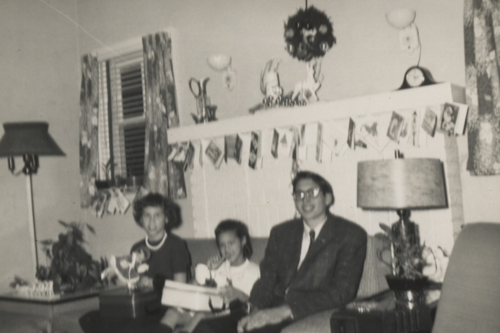 Written on back: Left to Right-Laura Greer, Caroline Greer, Jack ?. Xmas '56. - Creator