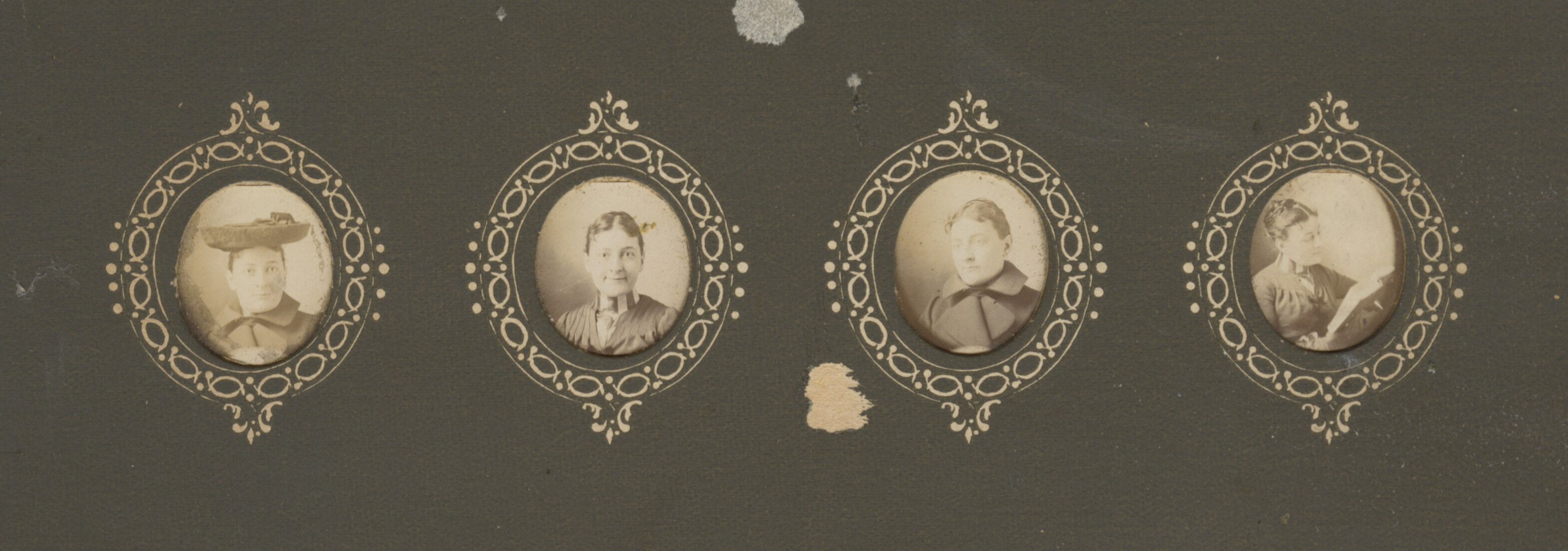 - 20.5 x 7.5 cm four miniature photographs mounted inside gray cardstock, decorative framing.