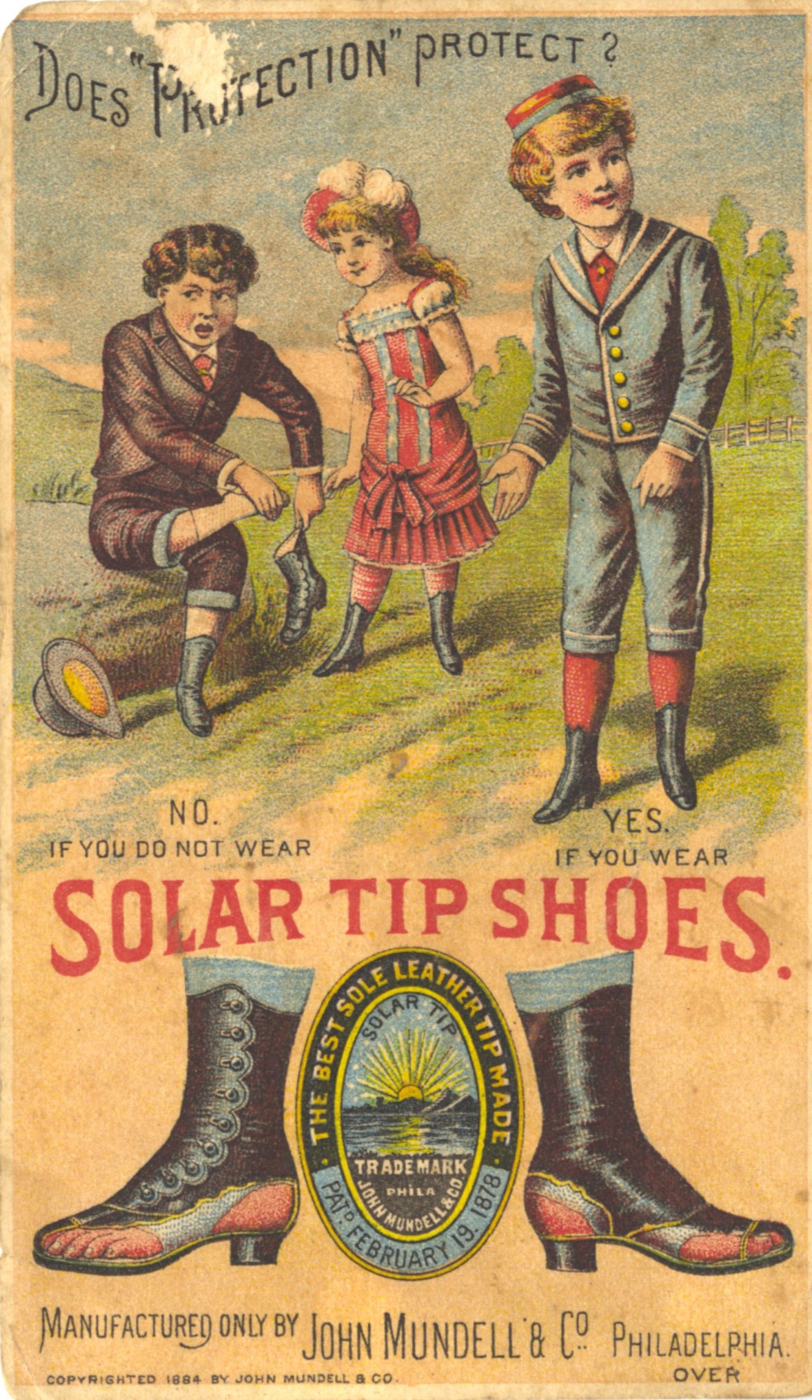 - Colorized ad for solar tip shoes sold retail at Tracy Shoe. Description of shoe on back of card.