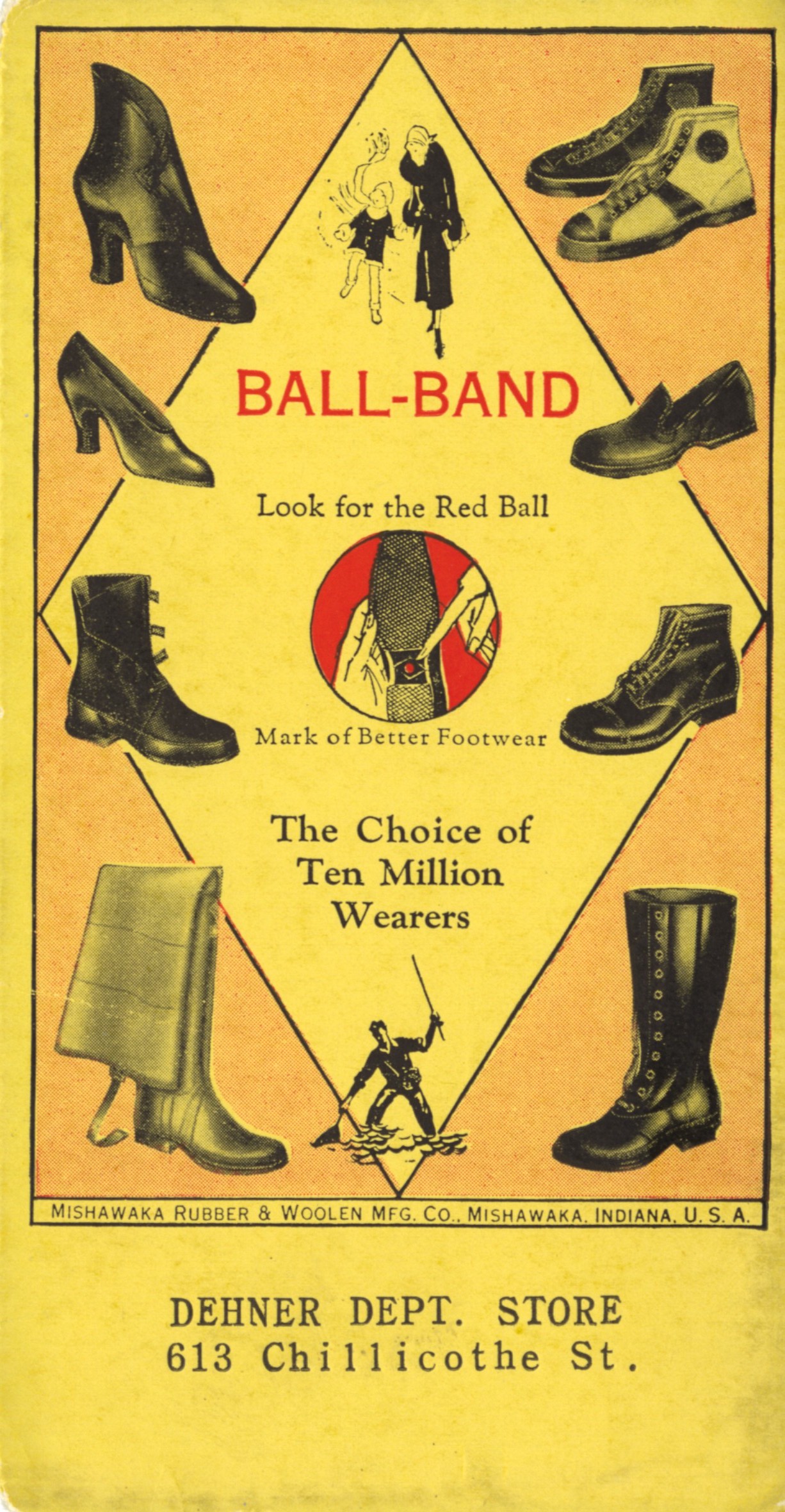 - Yellow card with shoe illustrations for advertisements-Red lettering, blue back side, no writing.