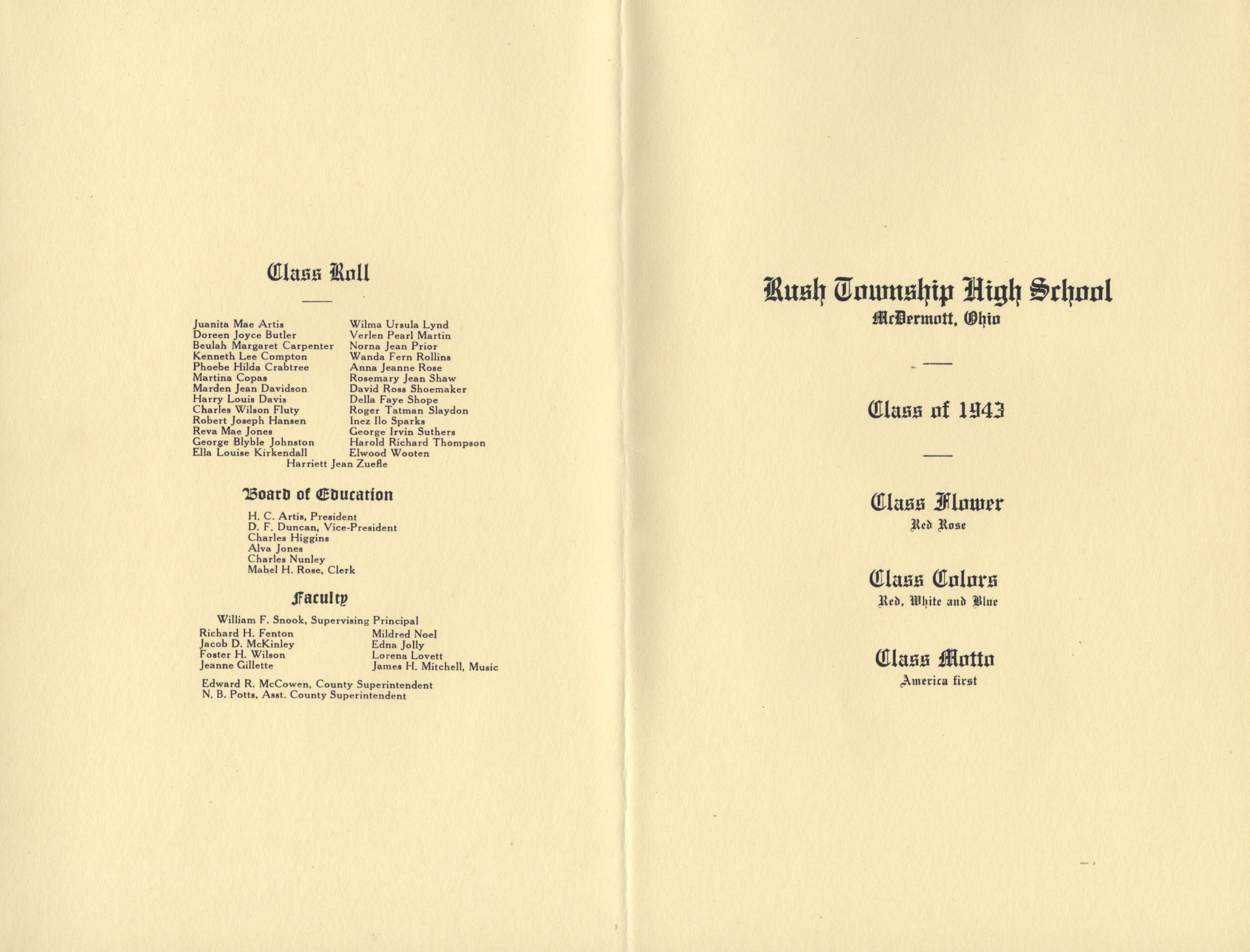 - Black & white text on off-white pages. The graduation program for Rush Township High School, McDermott, Ohio. The program is inside Norna Prior's graduation portfolio.