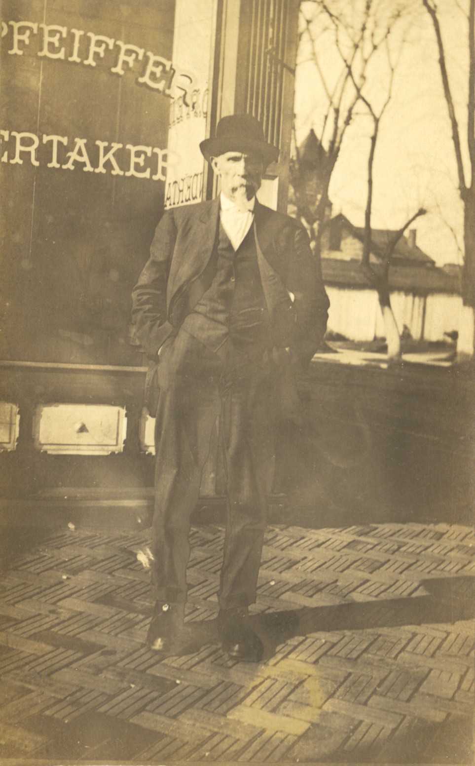 - Sepia tone photo of Mr George Pfeiffer standing in front of the business of Pfeiffer, Funeral Director/Undertaker located at 723 Chillicothe Street.