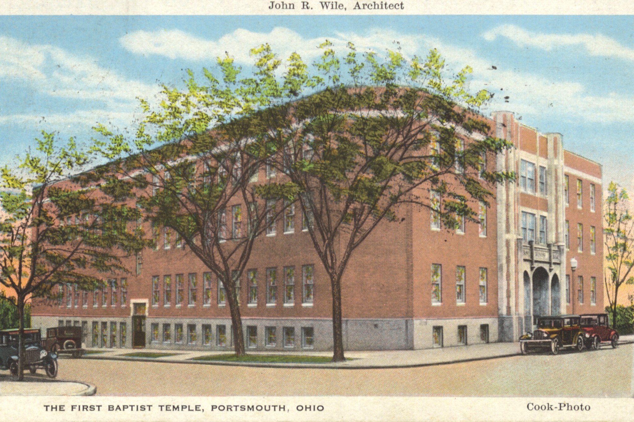 - Colorized Image of the building looking Southwest. Located on the corner of Gallia and Waller. Now known as Temple Baptist. Architect on front listed as John R. Wile. Built 1928.