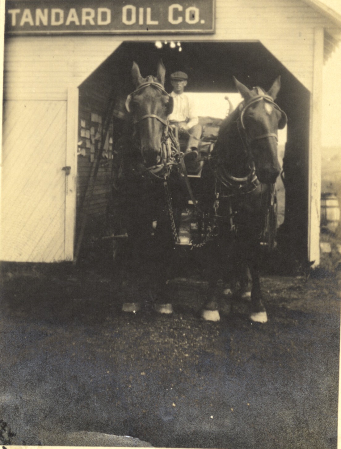 - Black and white photo of man in horse-drawn wagon. Standard Oil Company sign on building. Black photo has South Webster, O.
