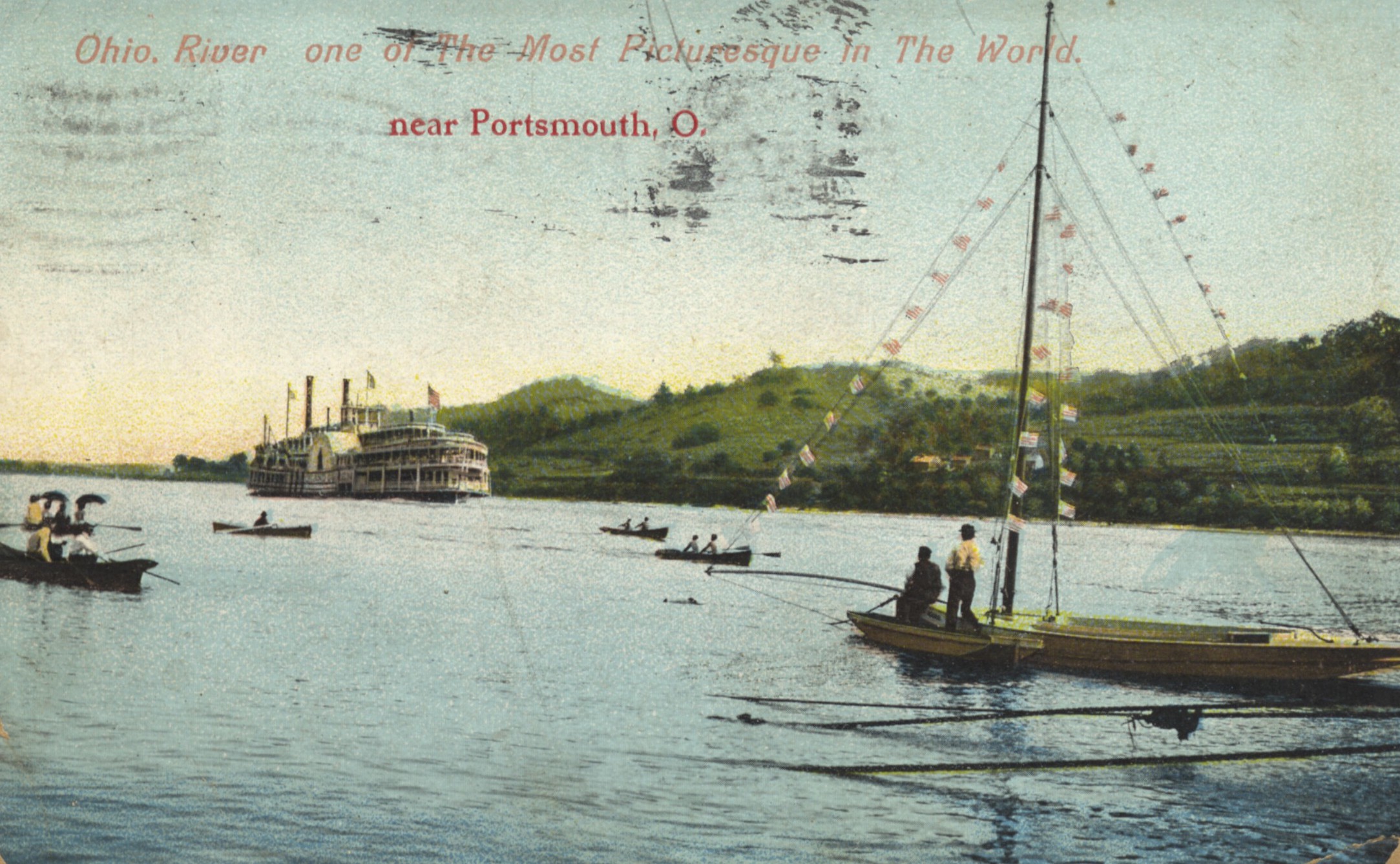 - Colorized photo image of the Ohio River near Portsmouth. Pictured are a steamboat and several people in smaller boats. Card is noted as from the "Coney Island Series."