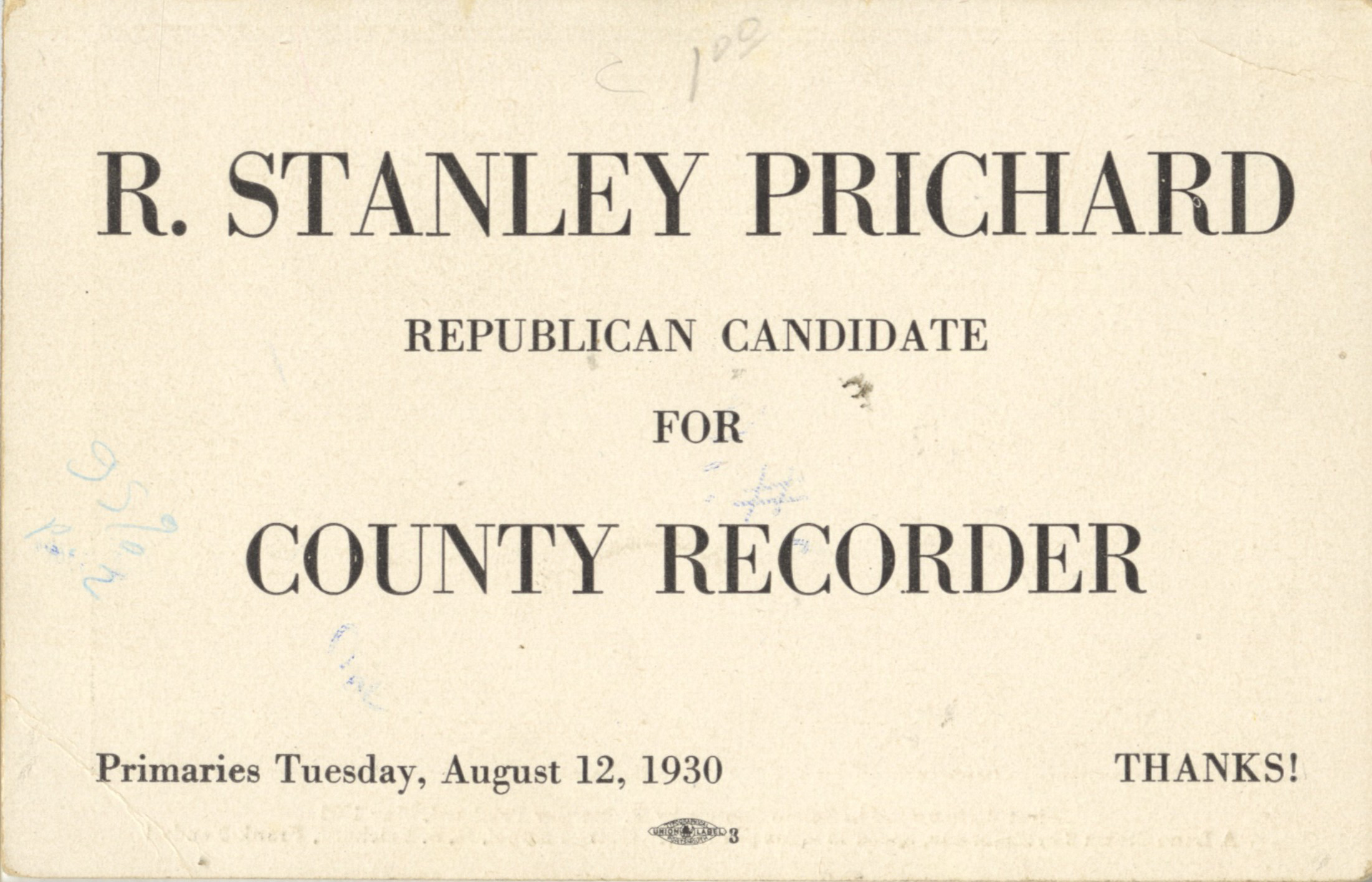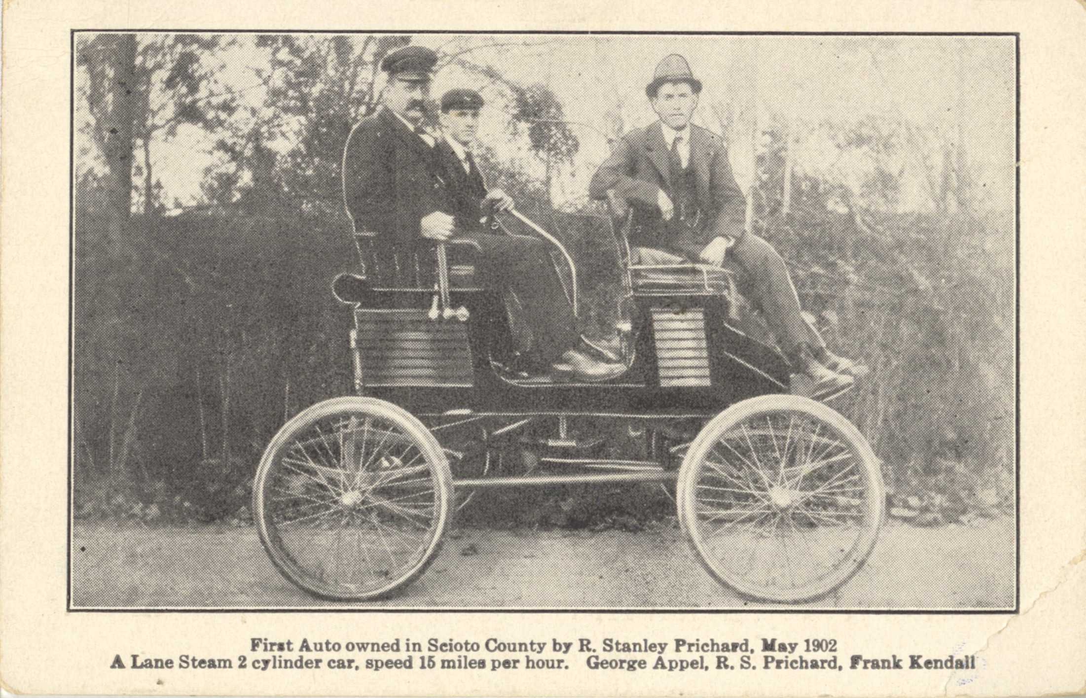 - Black & white photo image of the first automobile in Scioto County, owned by R. Stanley Prichard in 1902. George Appel and Frank Kendall are also in the car. This card promotes Mr. Prichard for County Recorder in 1930.